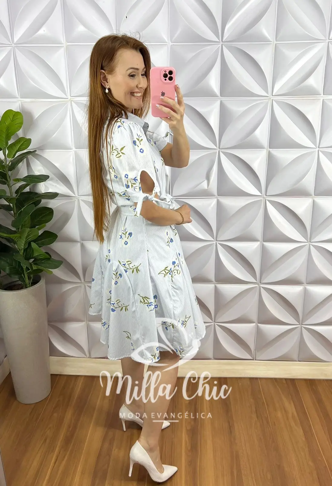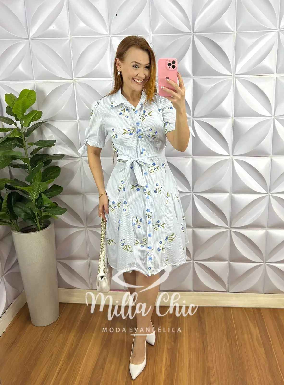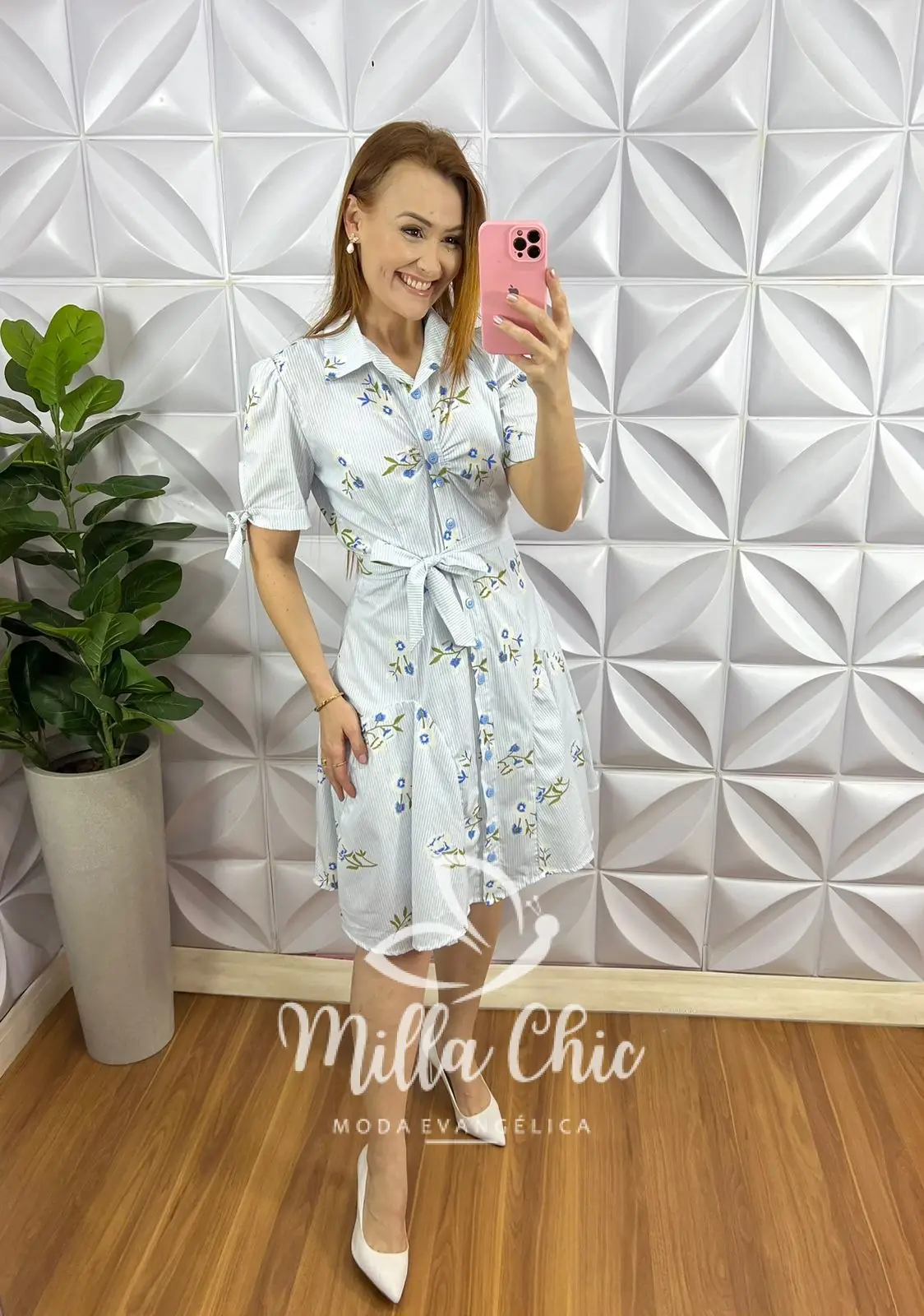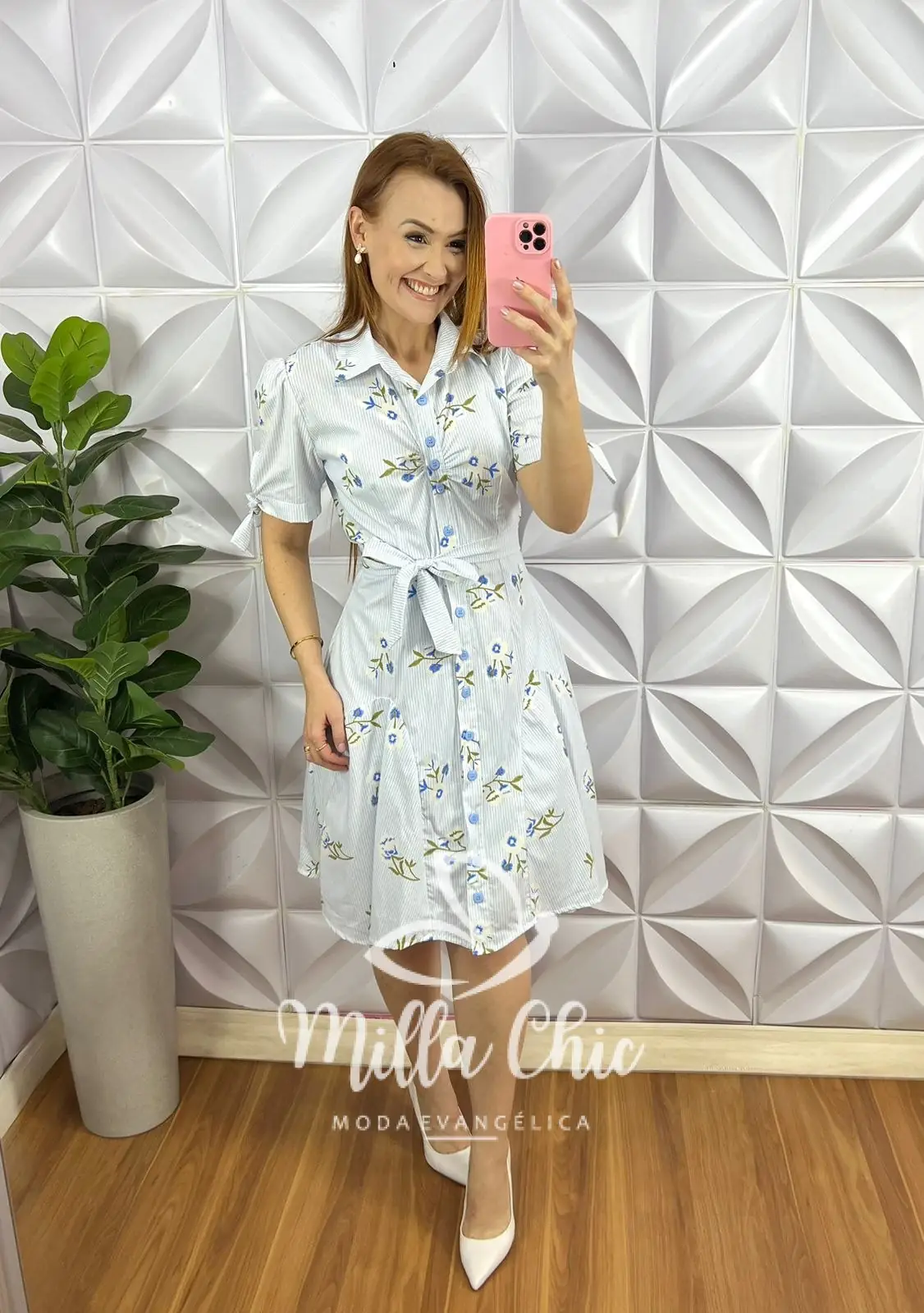 Possui: Gola Polo, manga princesa com fita na barra para laço, leve drapeados no busto, todo de botões funcionais, caimento evasê, modelo pizza com recortes, comprimento ate o joelho. Acompanha cinto faixa e camisolinha lisa de alcinha.