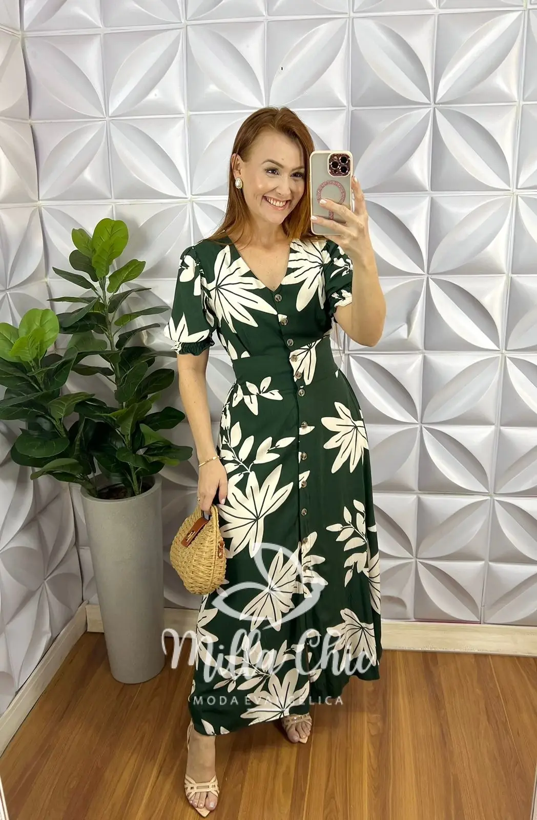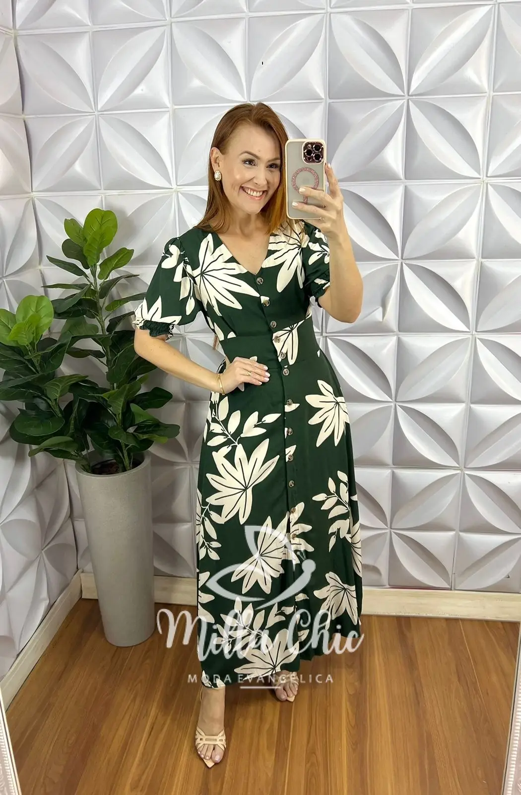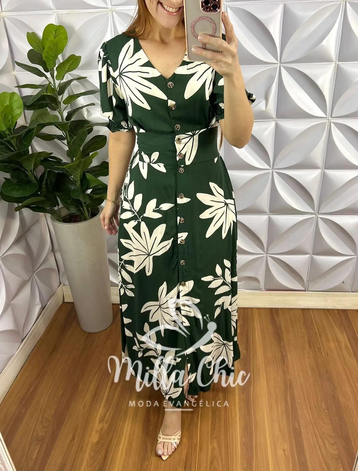Possui : decote V, Todo de botões funcionais ótimo para quem amamenta, mangas princesa, pala na cintura com lastex nas costas, comprimento longo, caimento evase, forrado na saia.