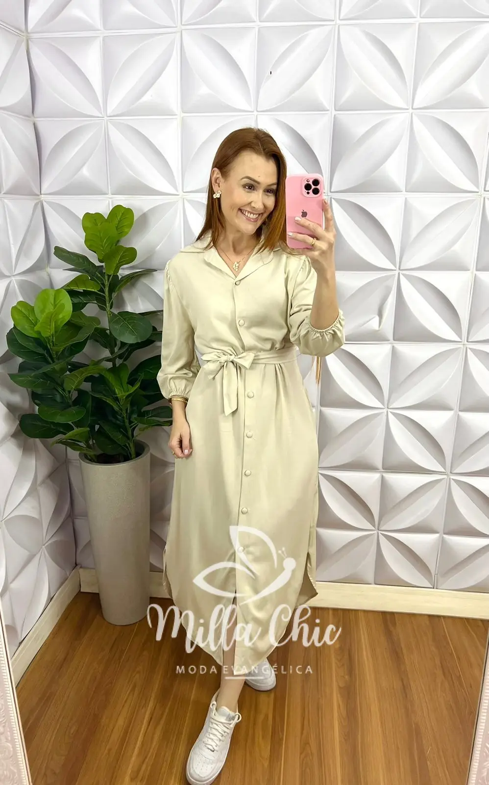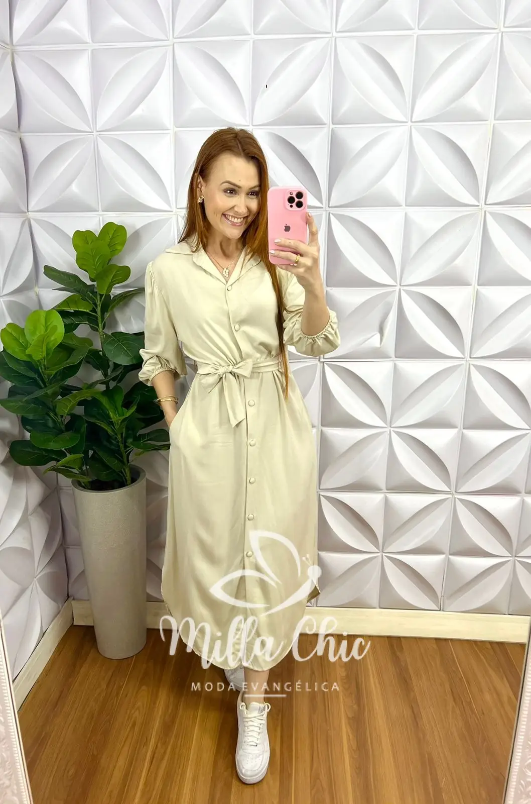 Chemise Viscose Sarjada Mídi Com Manga 7/8 Eduarda - Areia - Milla Chic