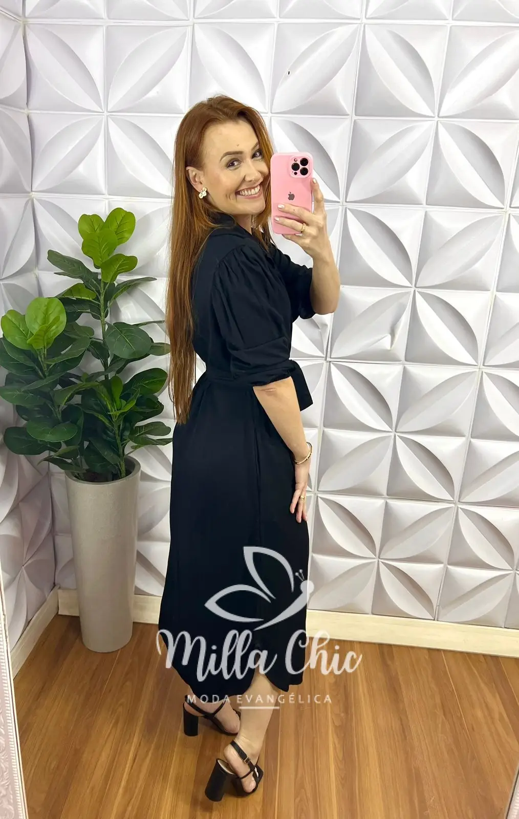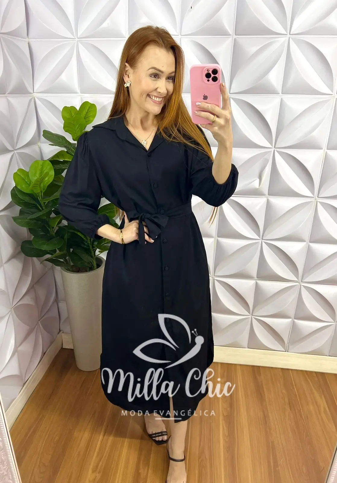 Chemise Viscose Sarjada Mídi Com Manga 7/8 Eduarda - Preto - Milla Chic