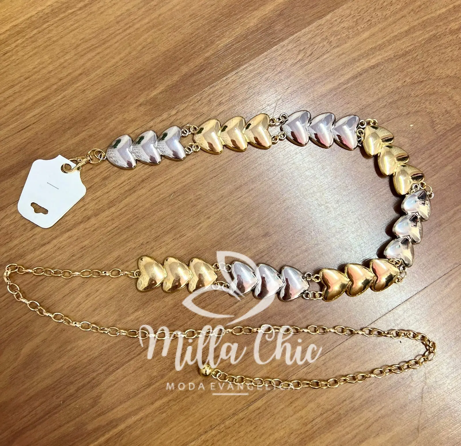 Cinto Com Trio De Coração bicolor Bianca – Prata e Dourado