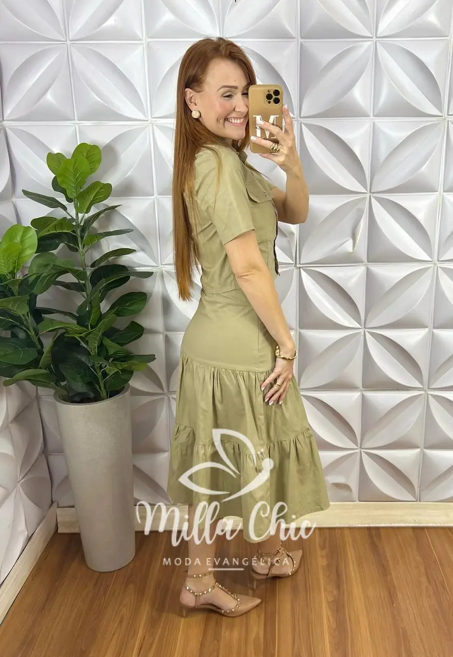 A camisa é na altura do cós da saia , tem os bolsos na frente todo estiloso e botões dourados todos funcionais.