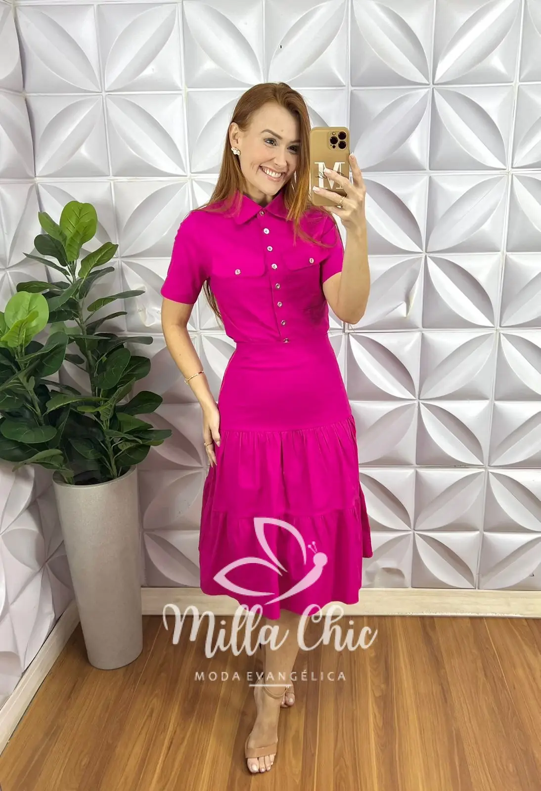 A camisa é na altura do cós da saia , tem os bolsos na frente todo estiloso e botões dourados todos funcionais.