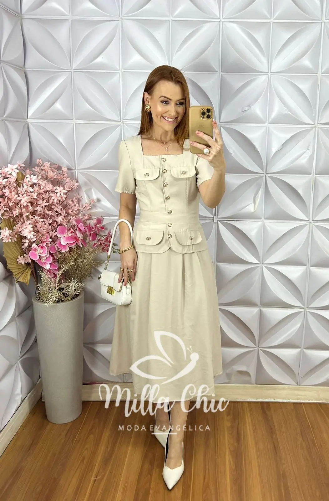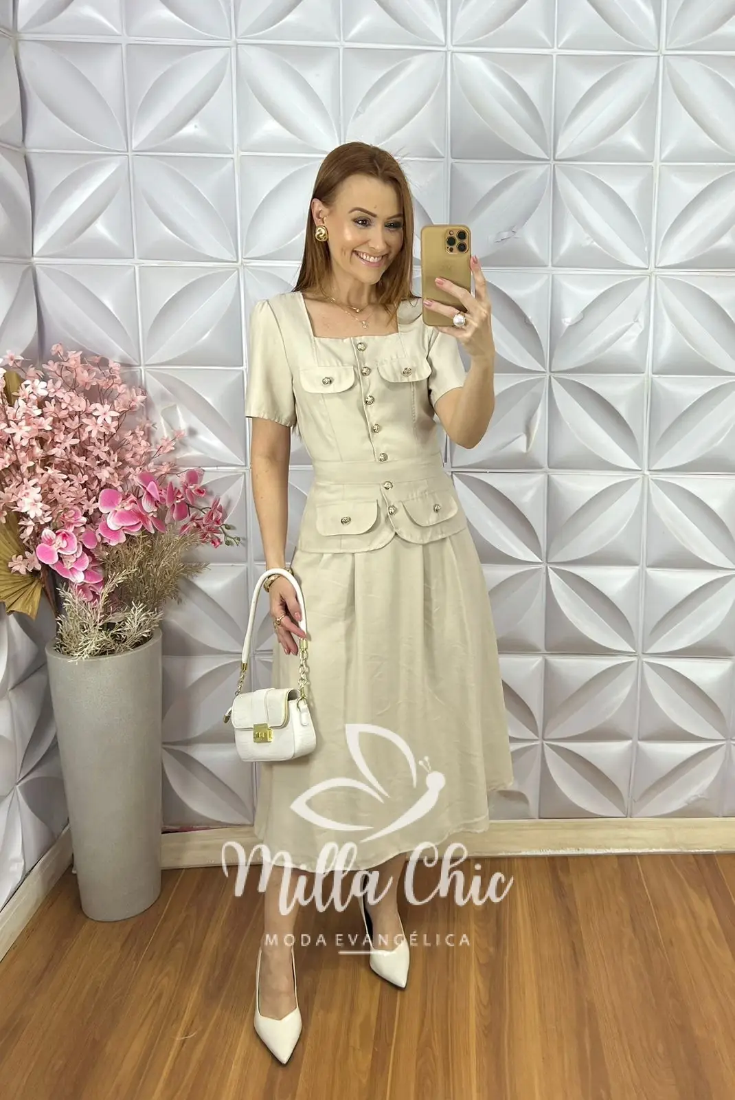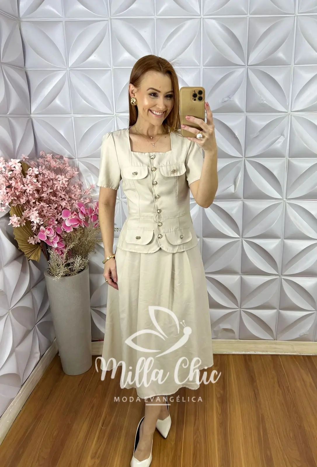 O conjunto Angelina se destaca pela blusa super estilosa e a saia godê com um caimento maravilhoso e vai te deixar linda e muito chic.