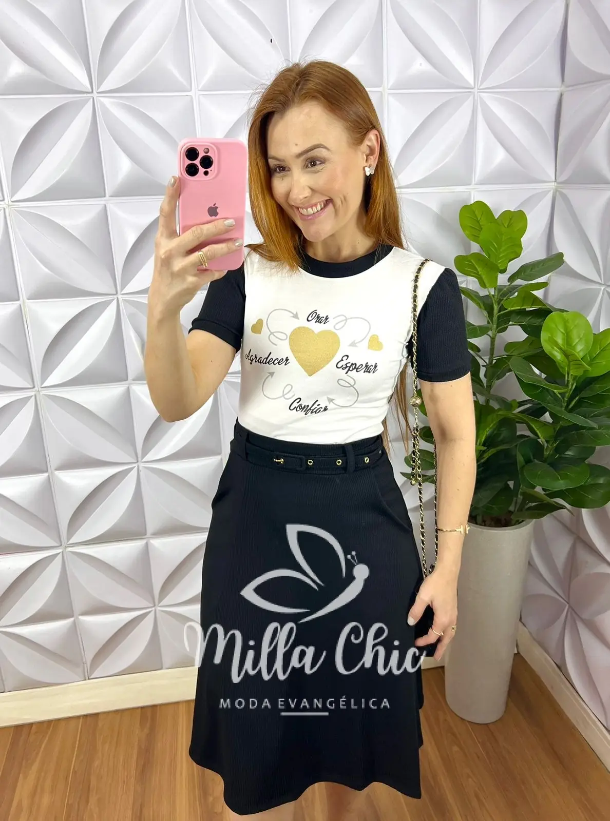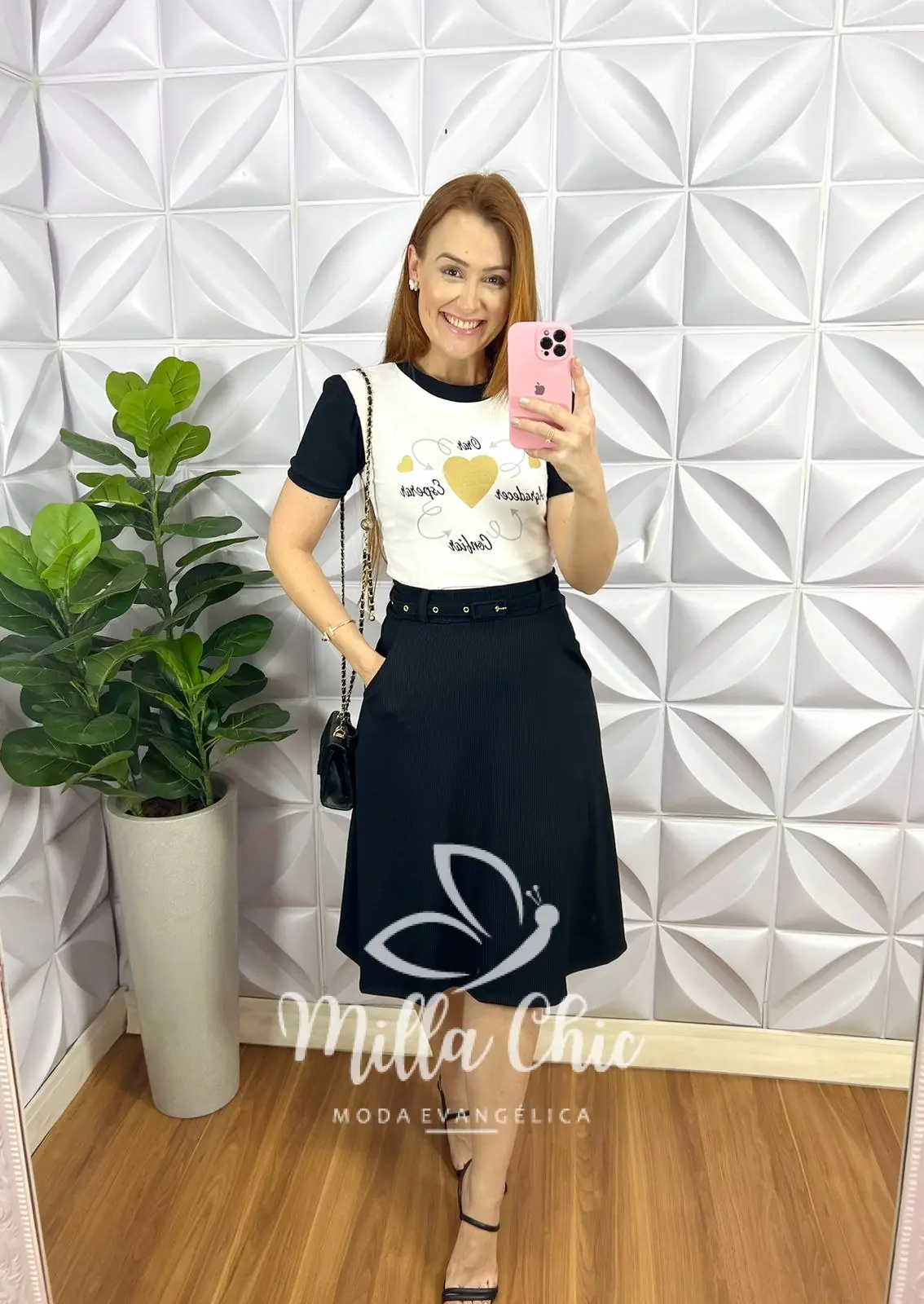A Tshirt de viscolaycra com silque de frases e coração que esta um charme! manga princesa no anarruga, gola canoa no anarruga, comprimento ideal. Saia com pala na cintura vestindo super bem, caimento evase com bolso nas laterais, comprimento ate o joelho, forrada. acompanha cinto encapado