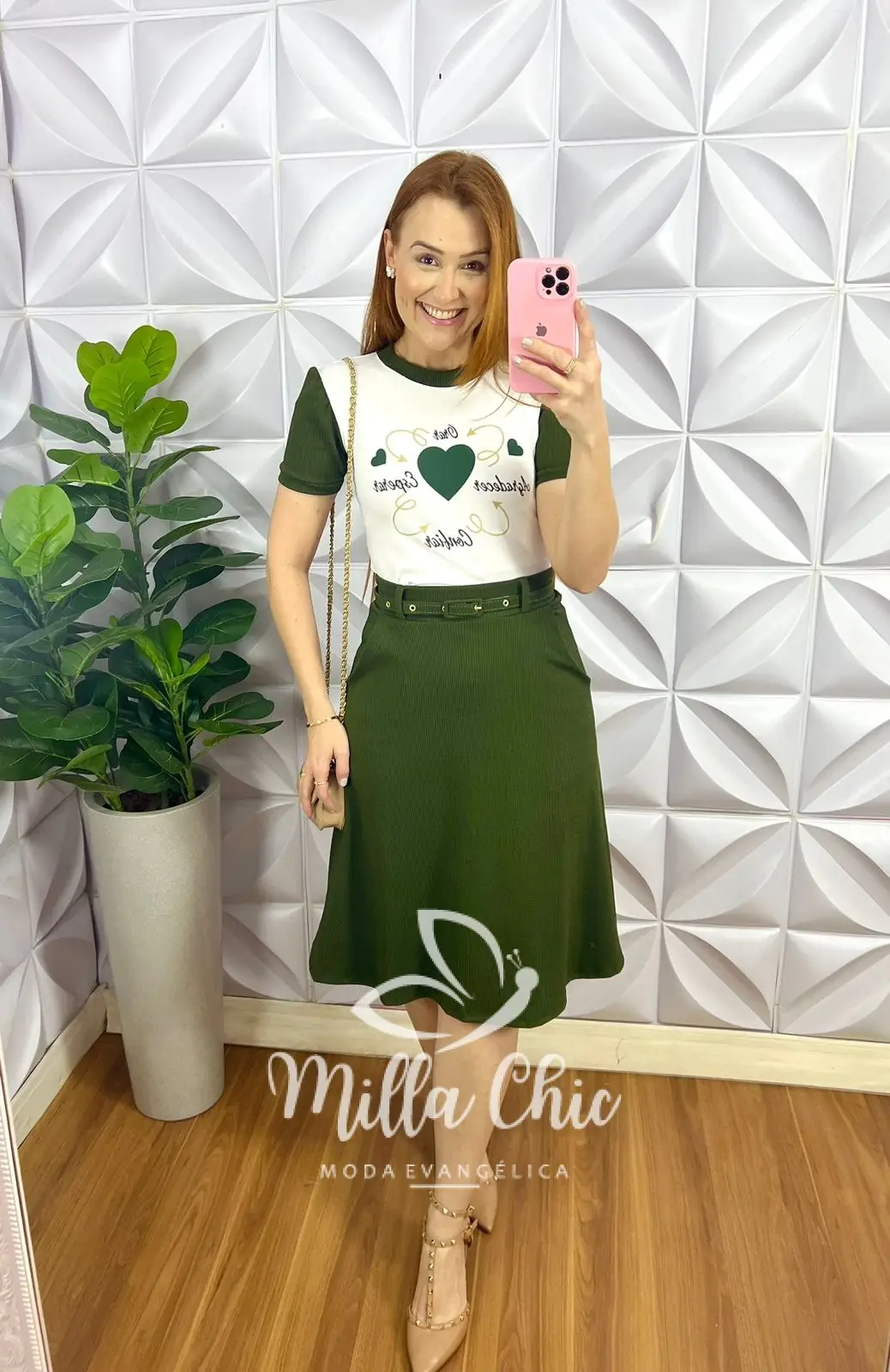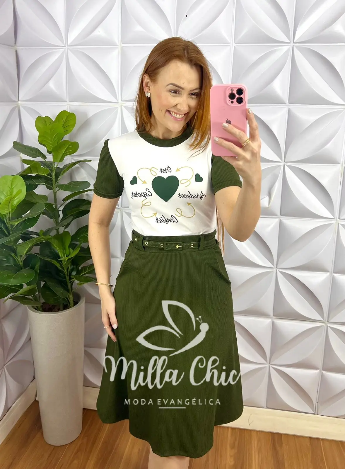 A Tshirt de viscolaycra com silque de frases e coração que esta um charme! manga princesa no anarruga, gola canoa no anarruga, comprimento ideal. Saia com pala na cintura vestindo super bem, caimento evase com bolso nas laterais, comprimento ate o joelho, forrada. acompanha cinto encapado
