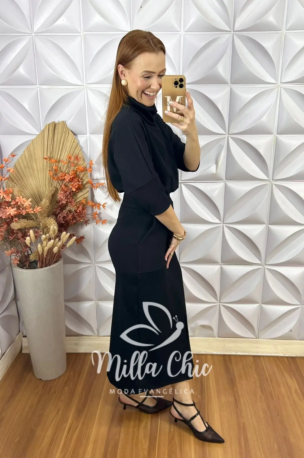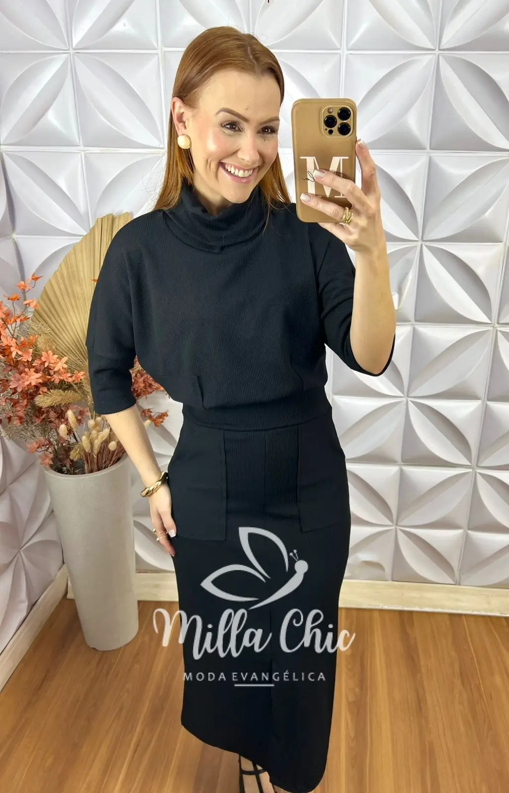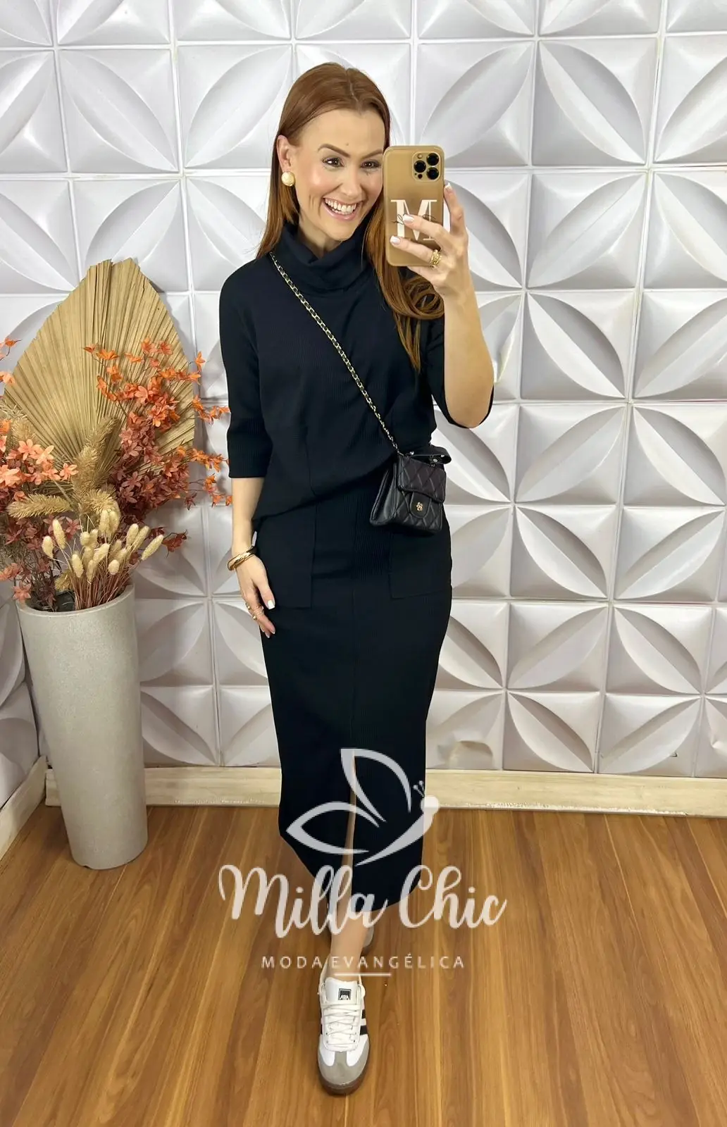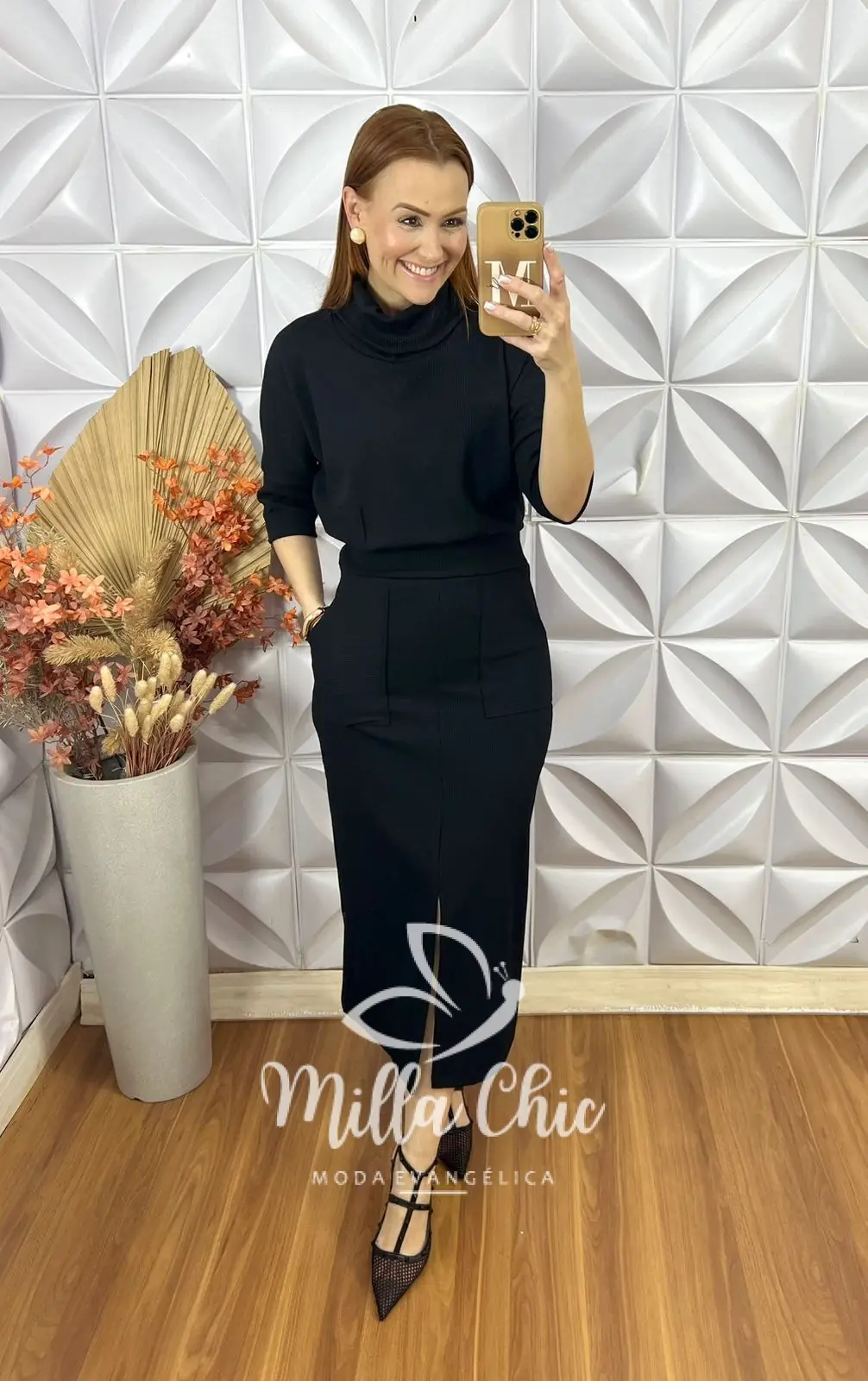 A saia é em modelagem reta com bolsos funcionais laterais em comprimento midi com fenda frontal que além de passar um charme e modernidade fica muito confortável.