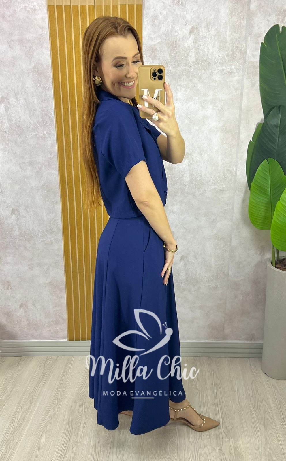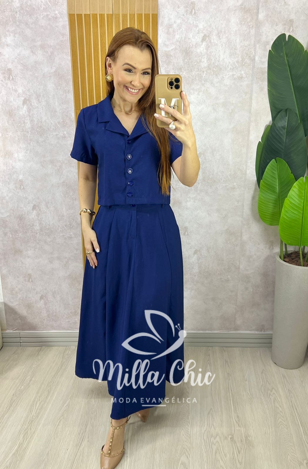 O conjunto Damares se destaca pelos detalhes encantadores, como a modelagem da saia perfeita que valoriza e a camisa estilo blazer .
