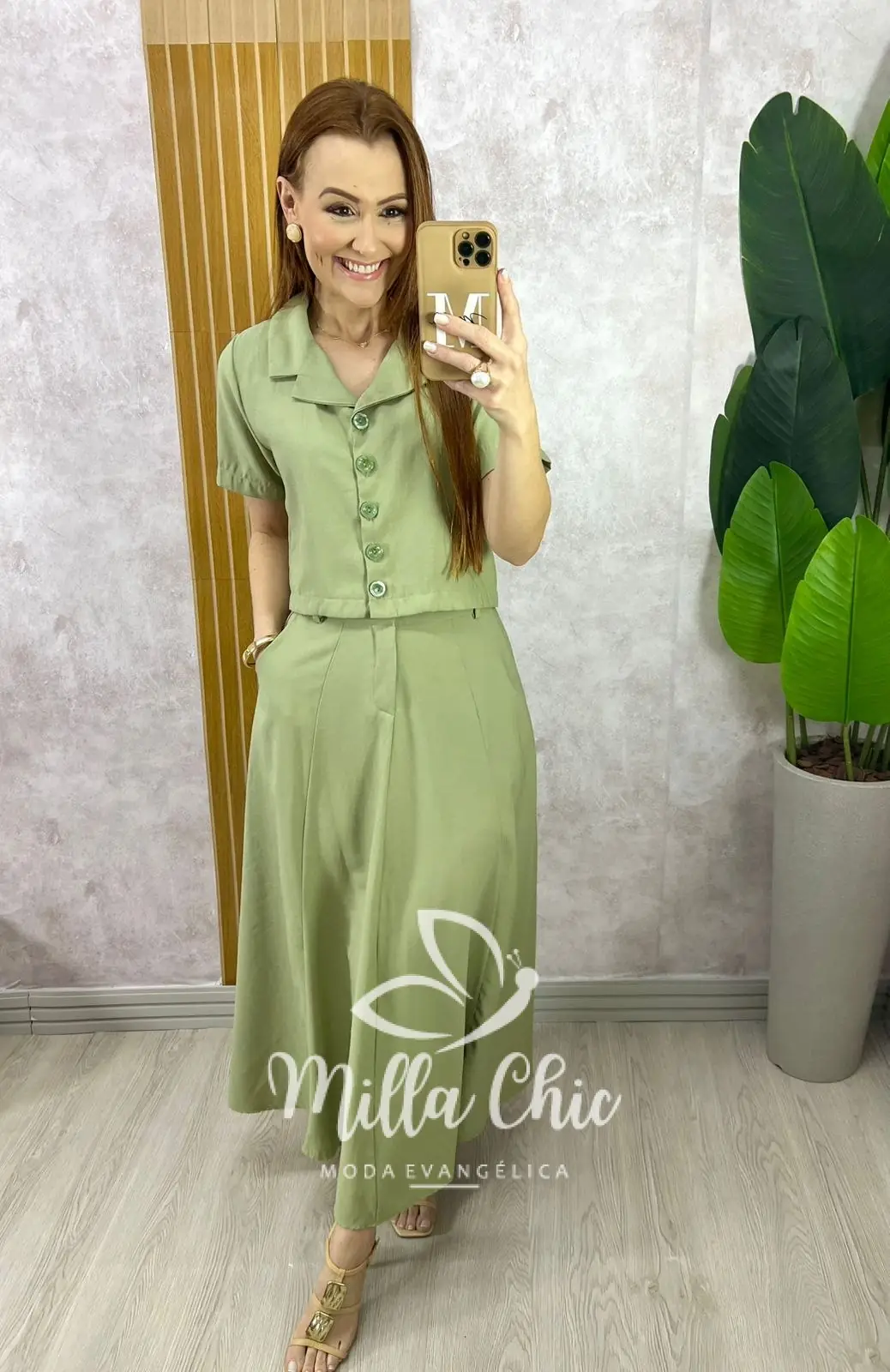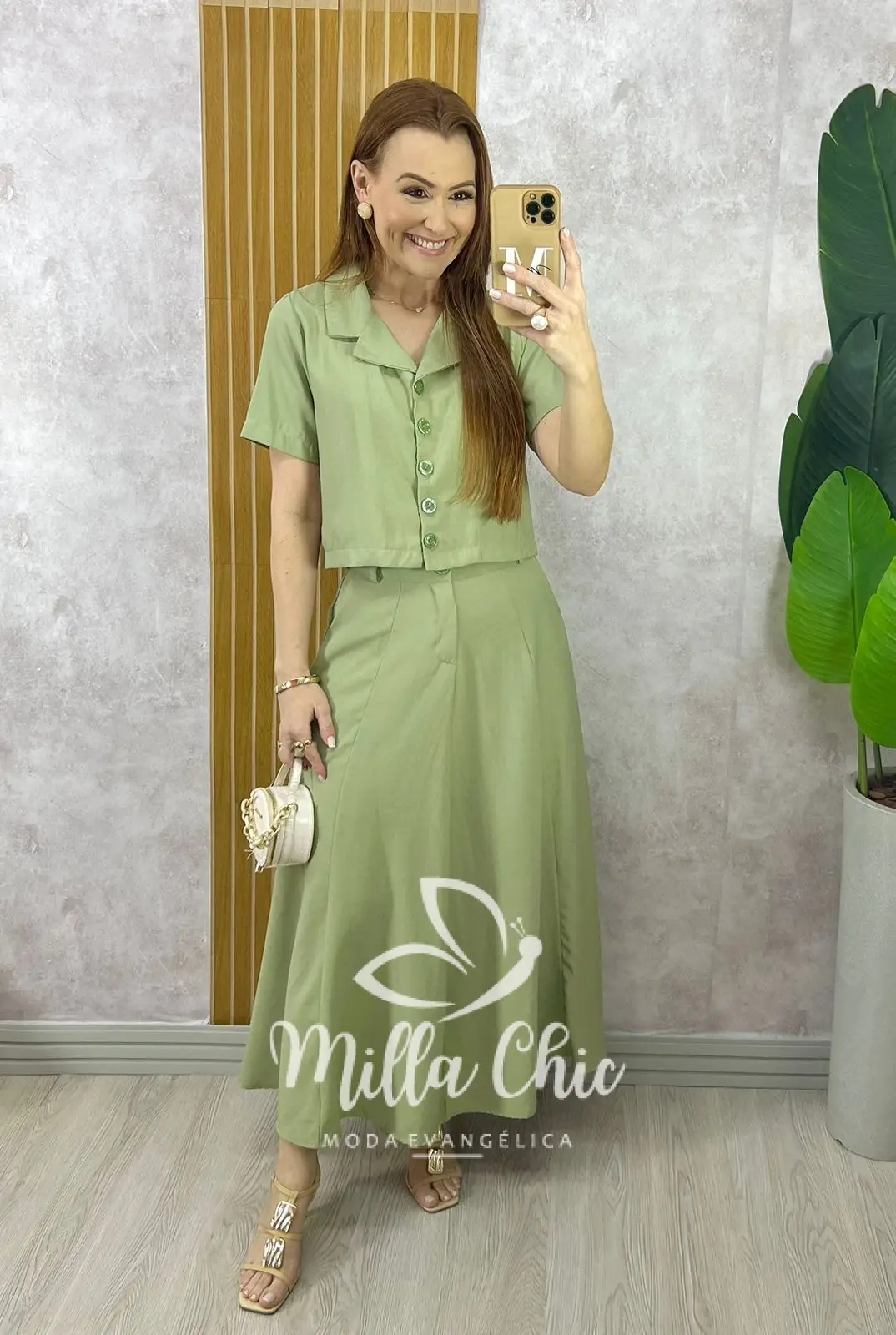 O conjunto Damares se destaca pelos detalhes encantadores, como a modelagem da saia perfeita que valoriza e a camisa estilo blazer .