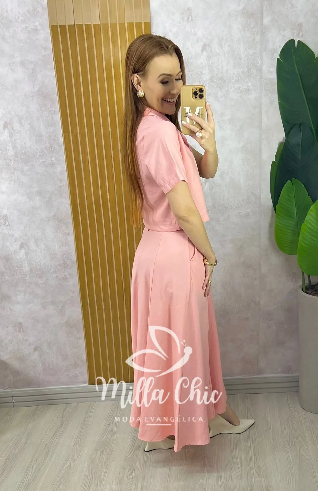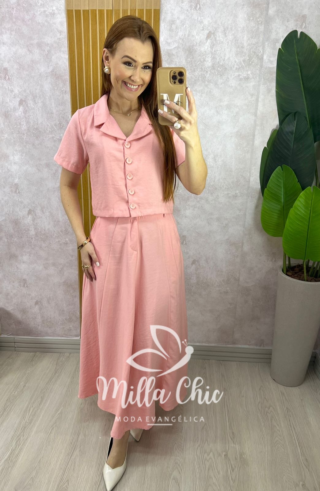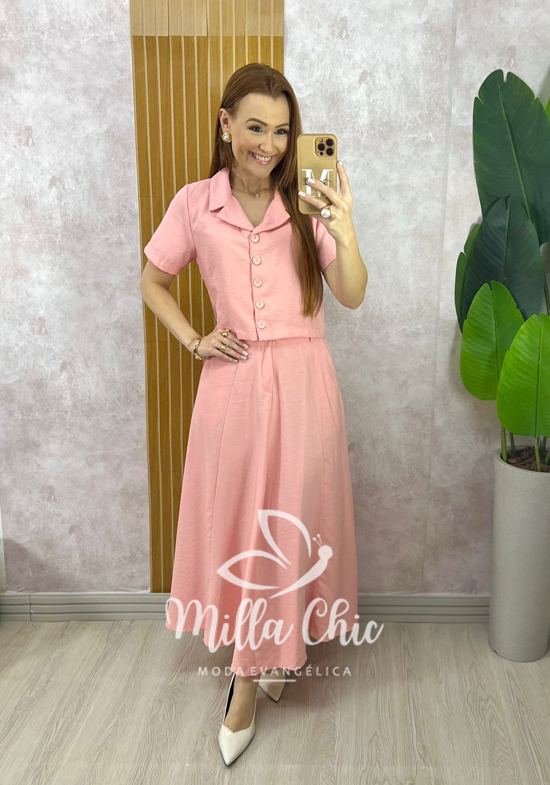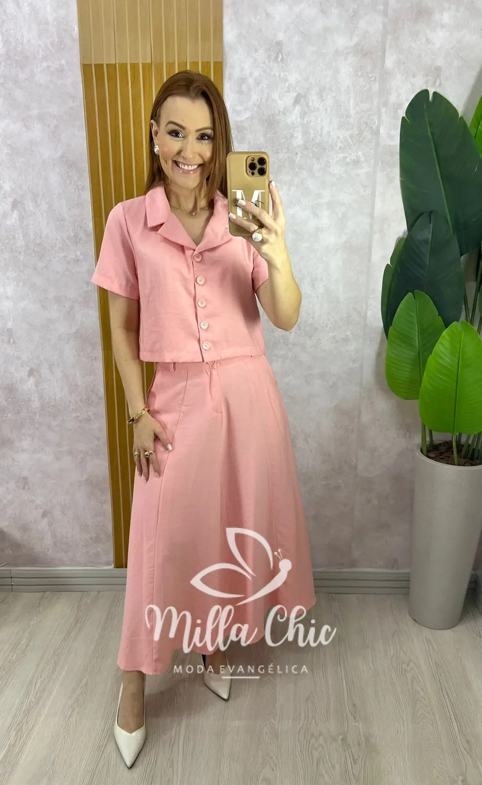 O conjunto Damares se destaca pelos detalhes encantadores, como a modelagem da saia perfeita que valoriza e a camisa estilo blazer .