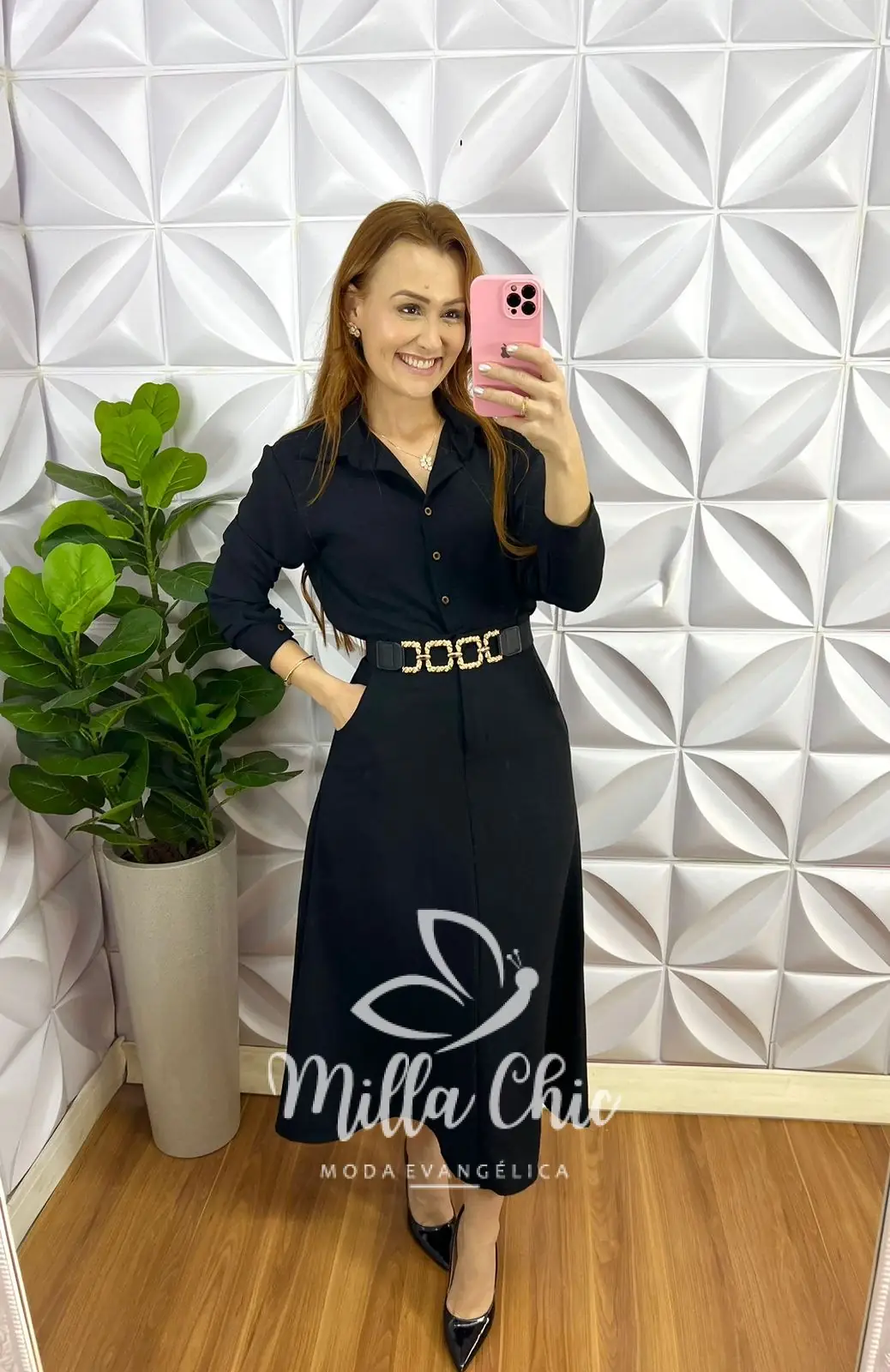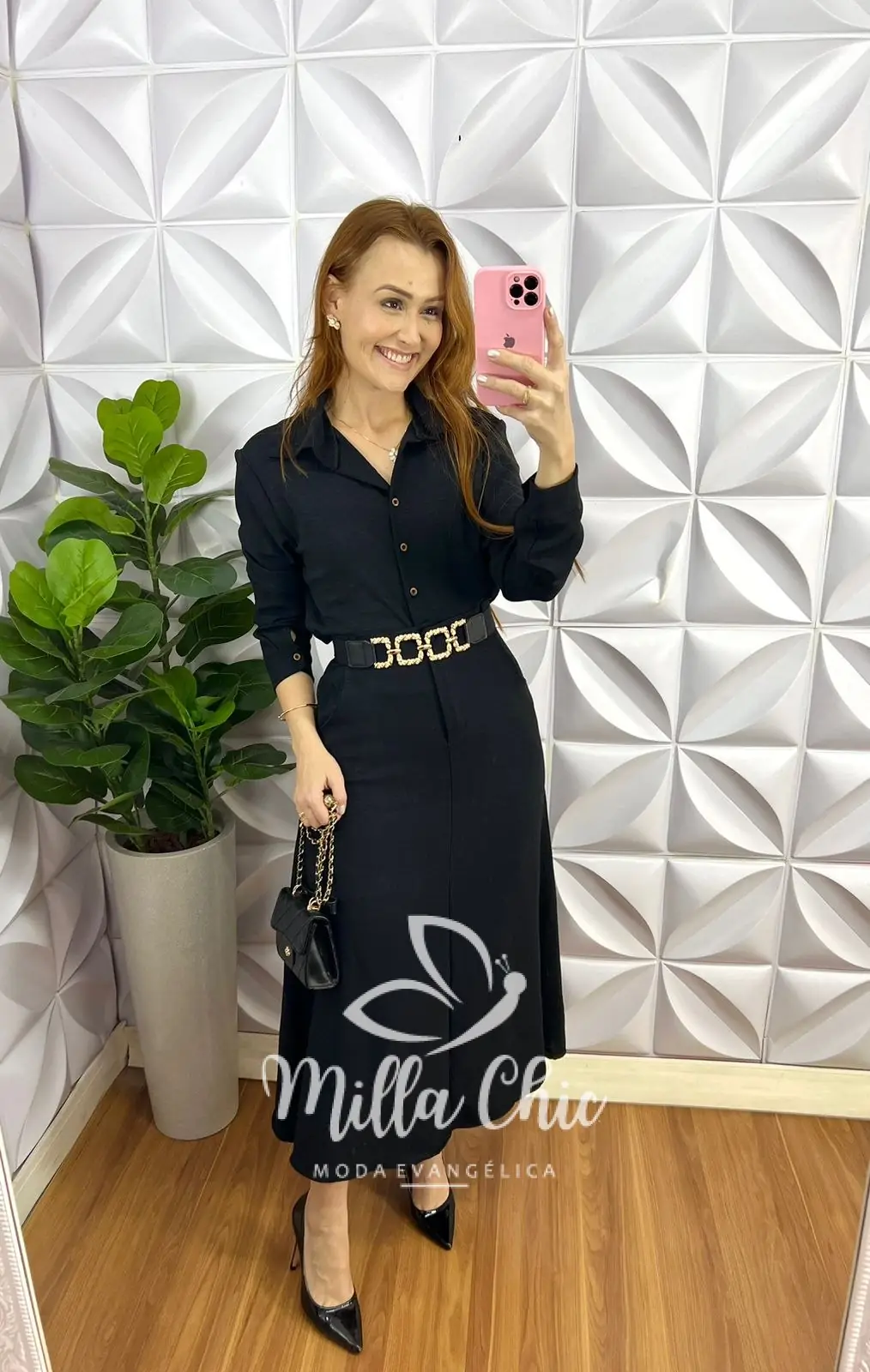 A Camisa Com Manga longa com punho marcado, botões funcionais, gola, comprimento ideal. Saia Pala na cintura botão encapado e zíper, caimento evase com bolso na lateral, comprimento Super Mídi.