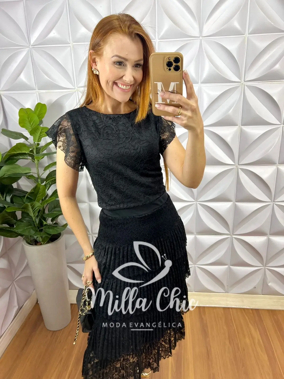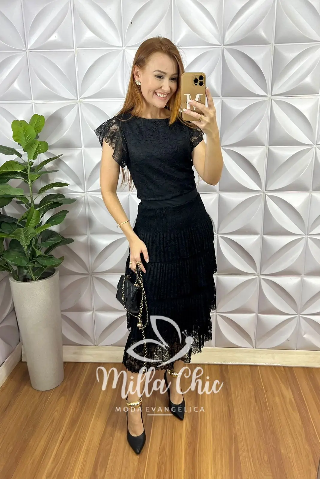Com a blusa com manga babado e a saia em camadas que traz aquela elegância e modernidade.