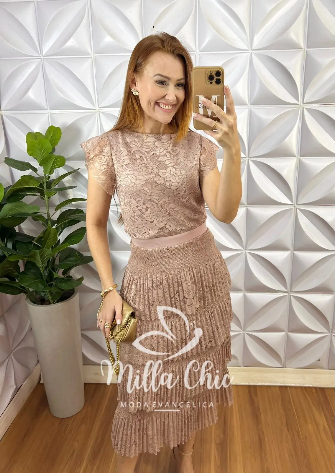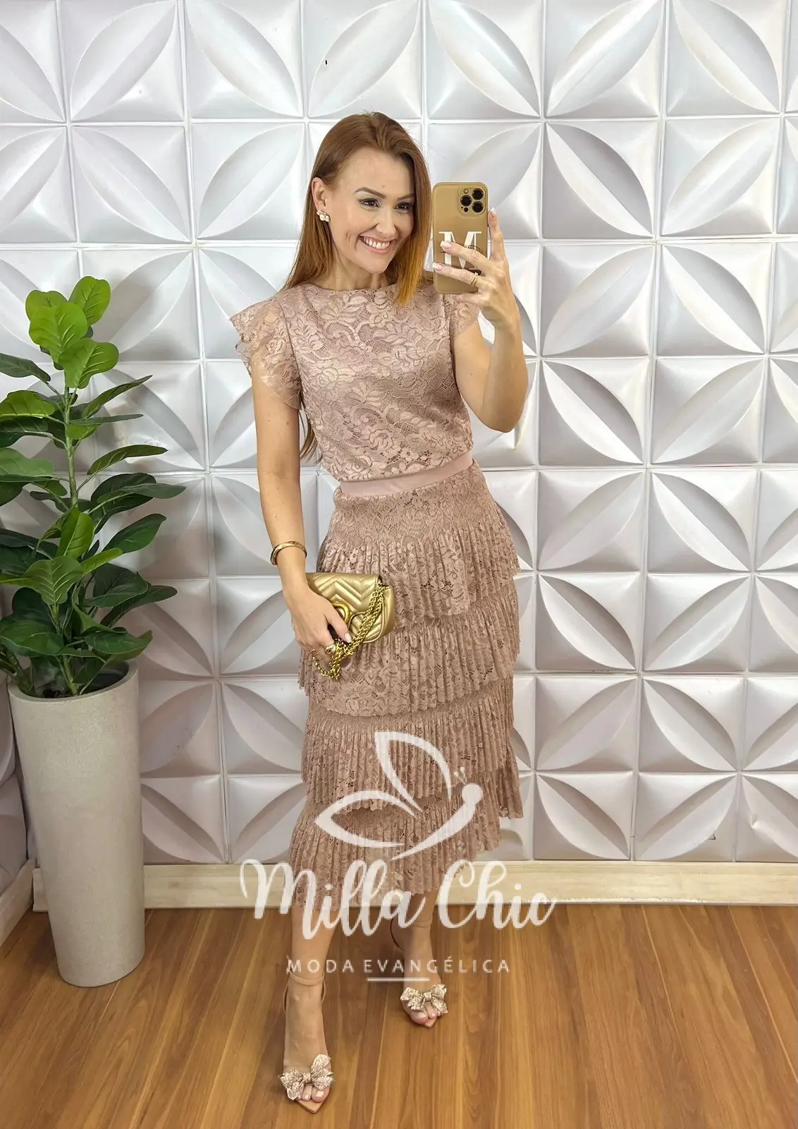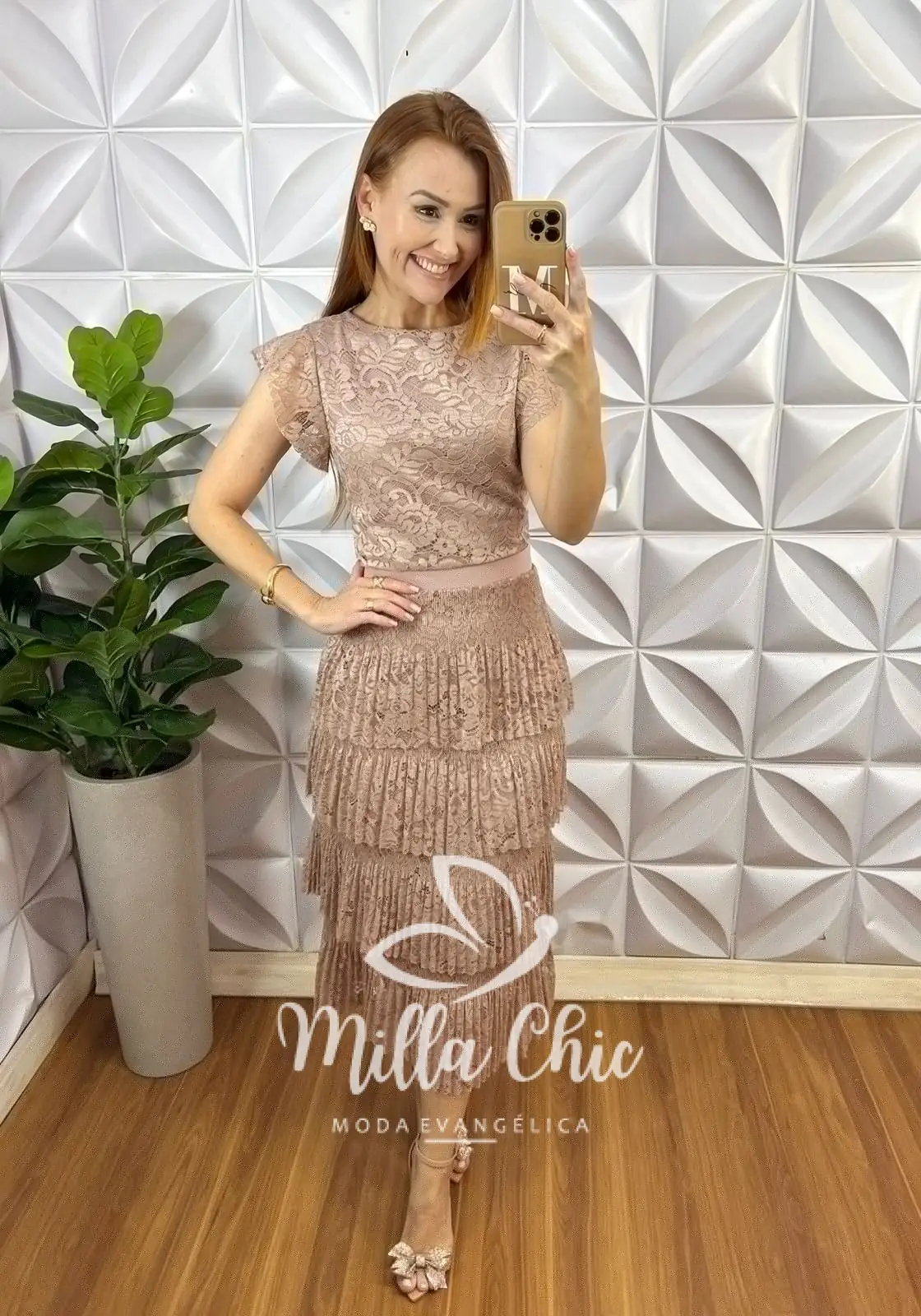 Com a blusa com manga babado e a saia em camadas que traz aquela elegância e modernidade.
