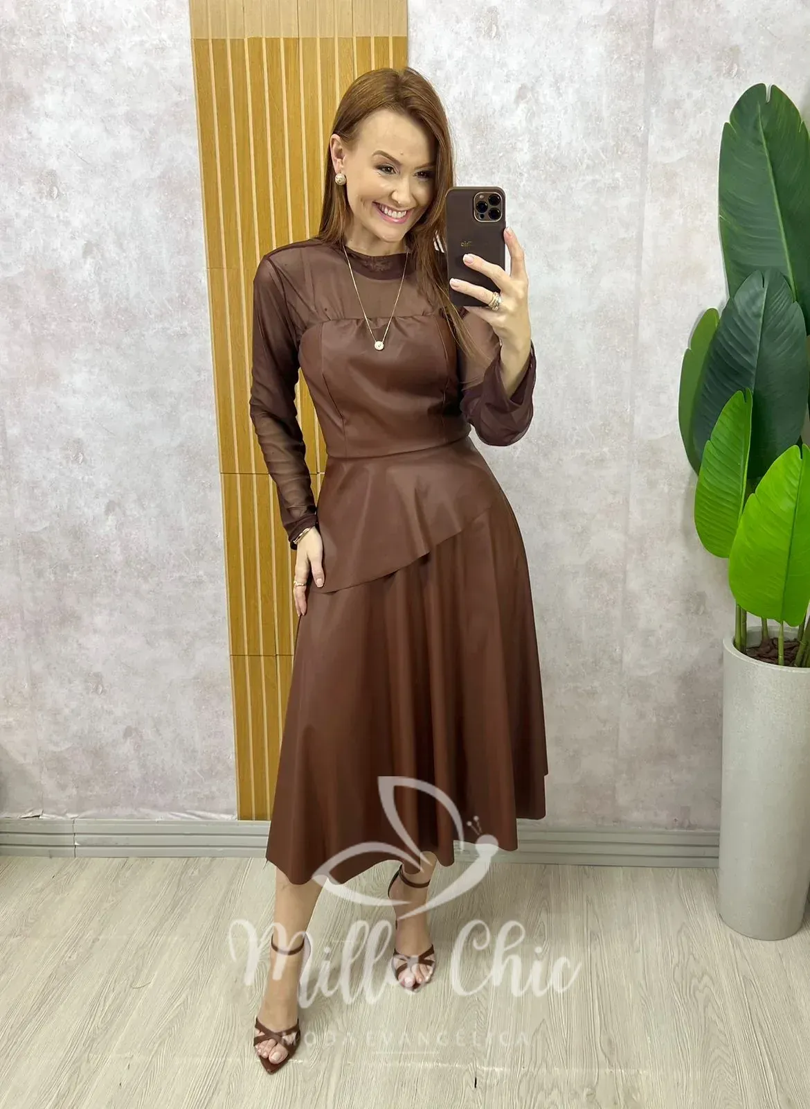 O destaque fica por conta do peplum assimétrico, tendência forte que traz movimento e sofisticação. A saia godê midi completa a produção com fluidez e feminilidade, também com zíper nas costas para um ajuste perfeito.