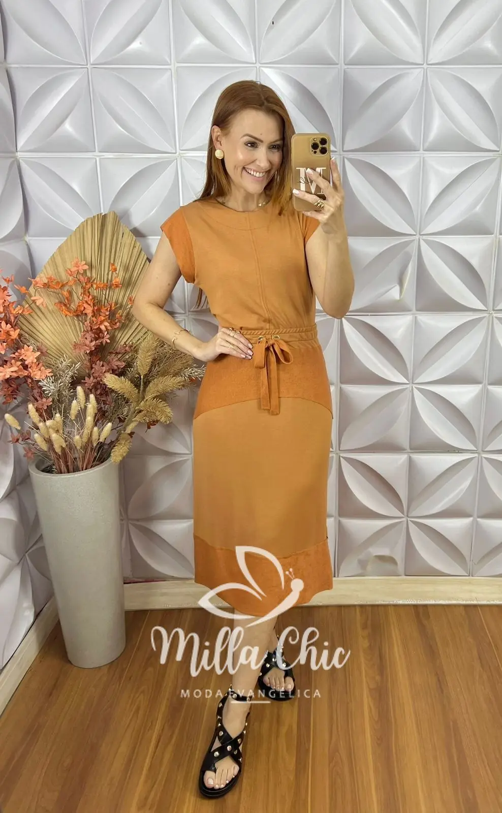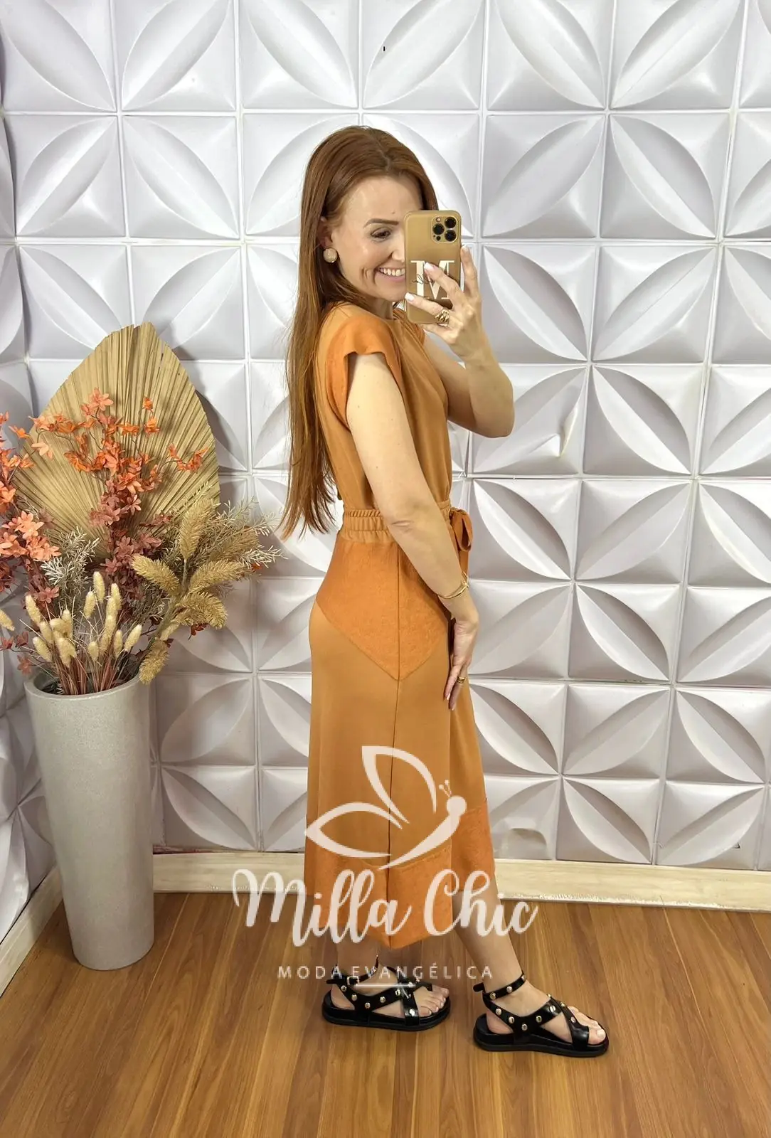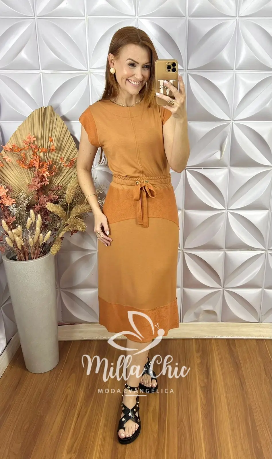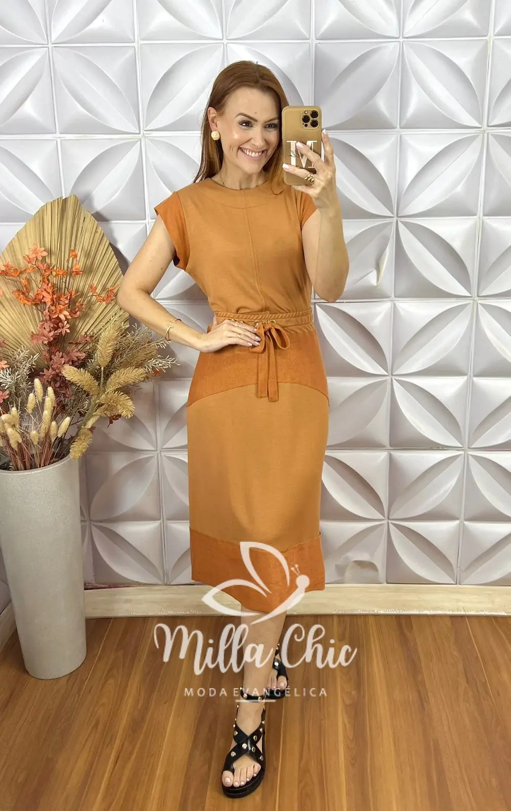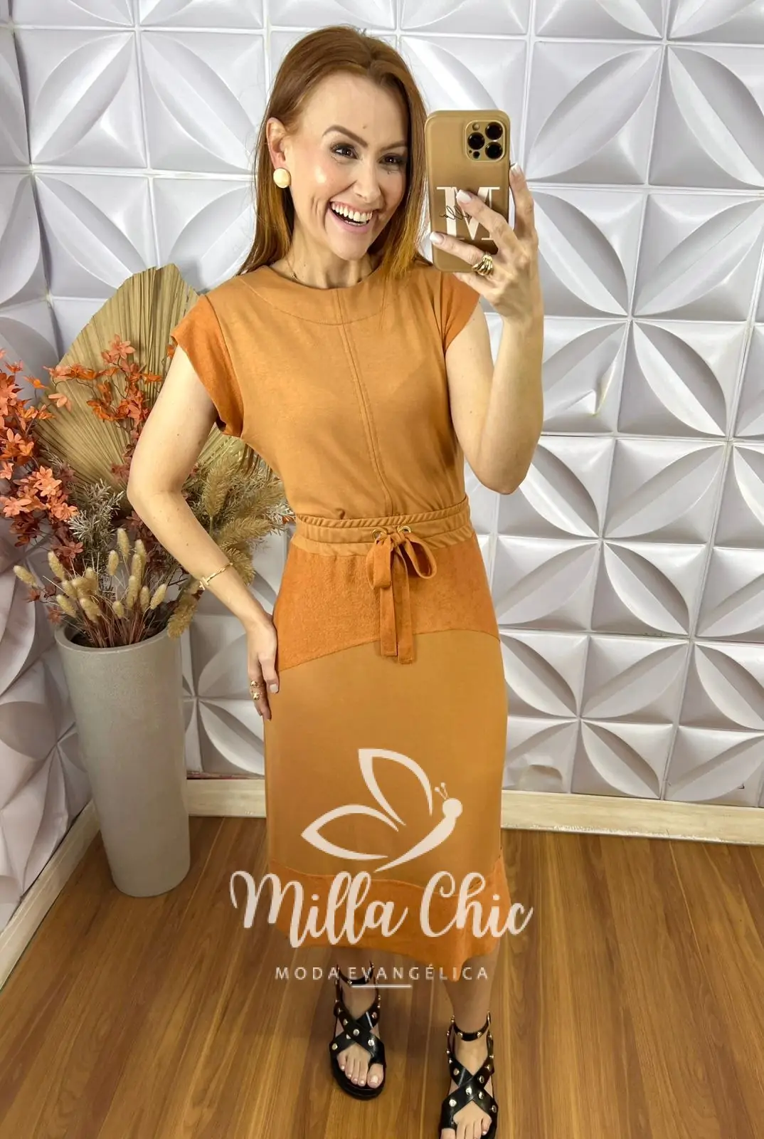 Possui: Blusa com gola U marcada, manga Muscle, recorte no centro, com comprimento ideal. Saia com pala na cintura de Elástico, caimento levemente evase com recortes, comprimento Mídi.