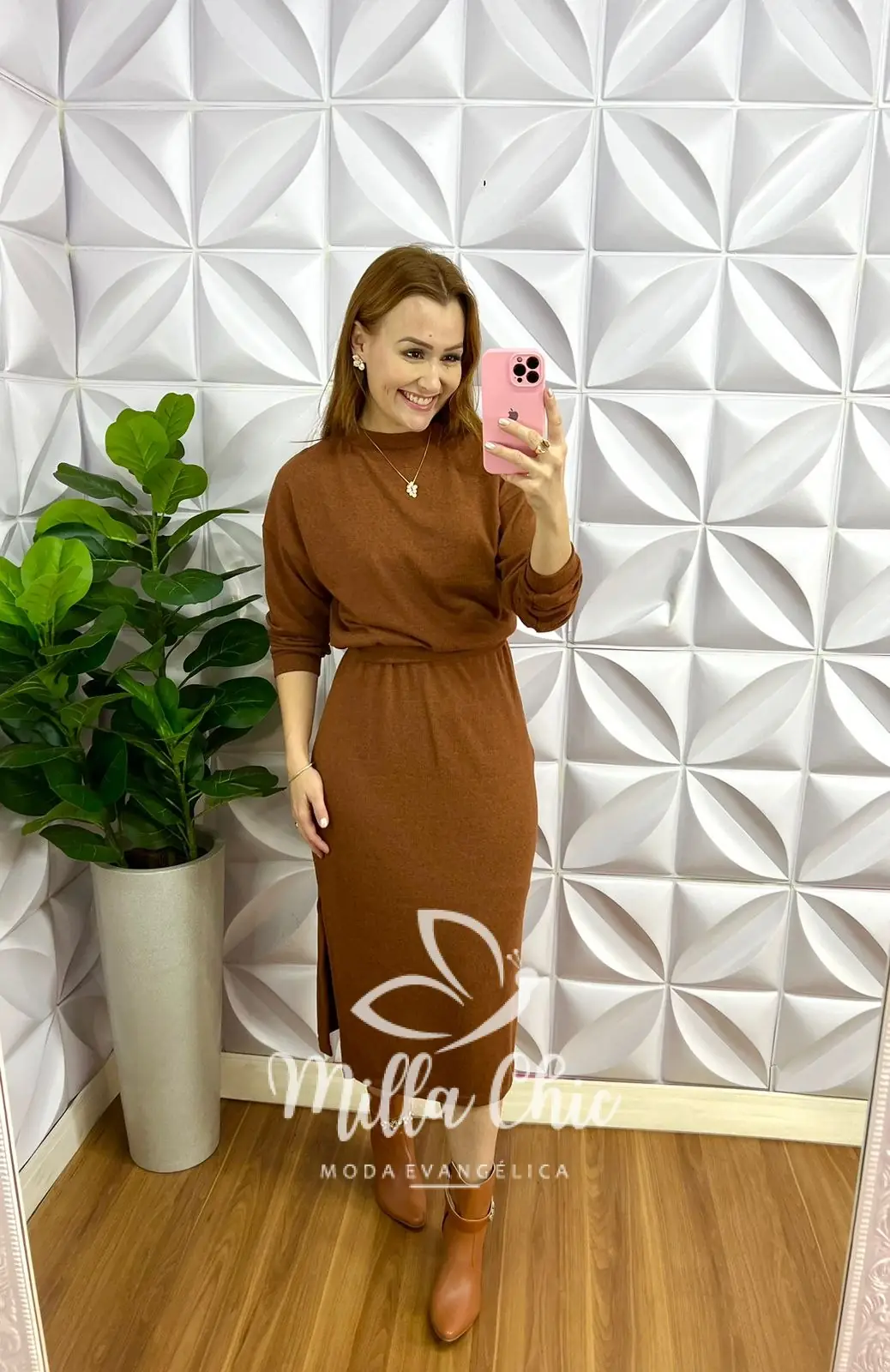 Conjunto Lãzinha Manga Longa Saia Mídi Maya - Caramelo - Milla Chic