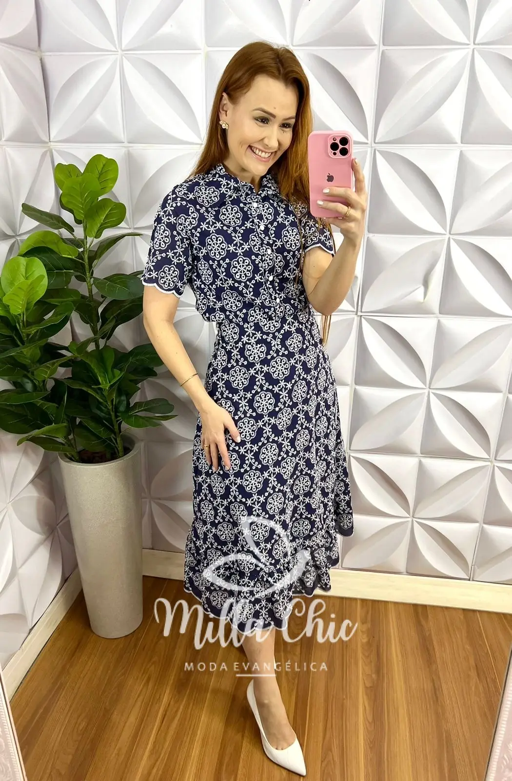 A Camisa Toda forrada, com gola, todo de botões (funcional), manga com transparência, comprimento ideal. Saia com zíper nas costas, pala na cintura, caimento evase, com detalhe na barra, comprimento mídi, toda forrada.