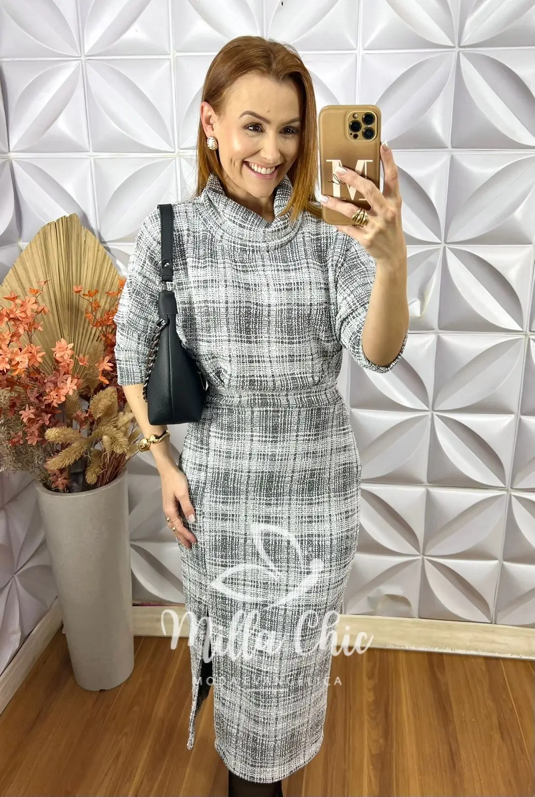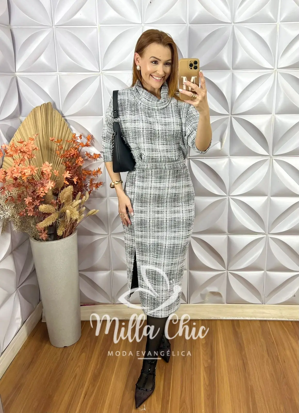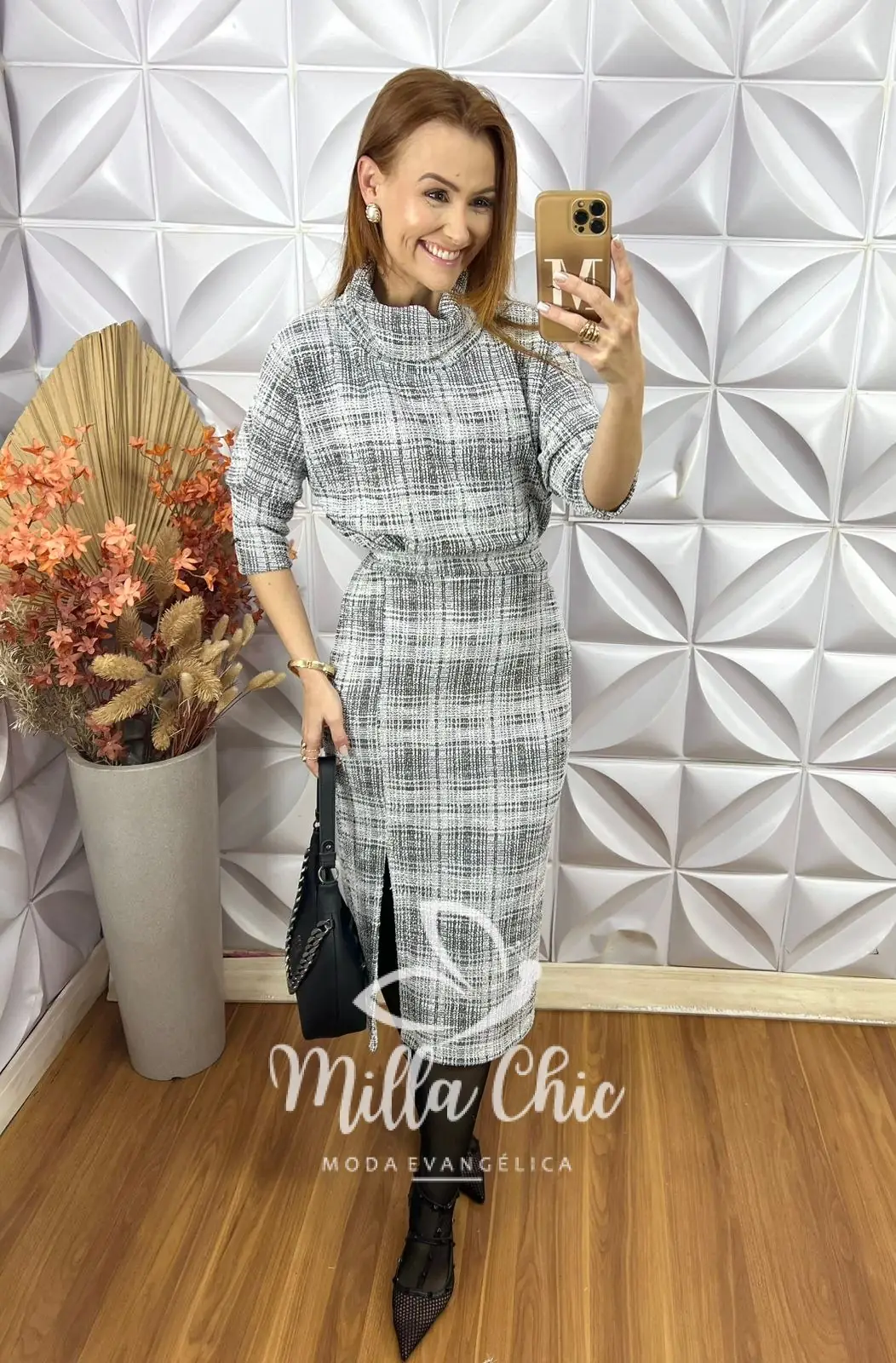 O conjunto Lilian é confeccionado em tweed channel com trama diferenciada e padronagem preta e branca , trazendo um toque de elegância e sofisticação à peça.