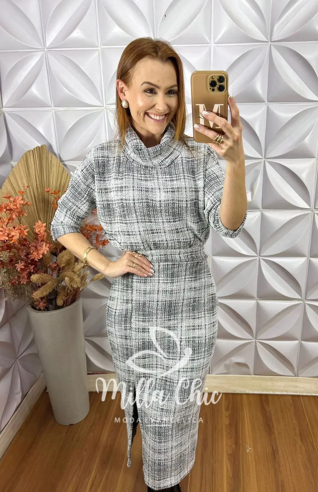 Aquele conjunto que vai te deixar muito elegante. A blusa possui manga 3/4 que fica um charme e a gola boba que traz conforto e uma elegância sem igual .