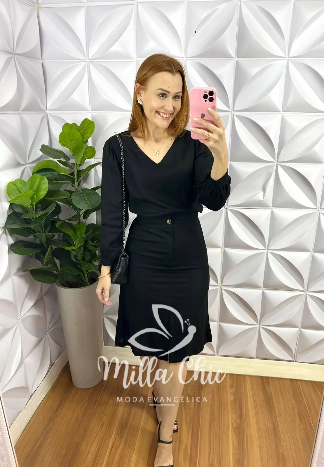 Conjunto Linho Blusa Manga Longa Saia Com Fenda Sarah - Preto - Milla Chic