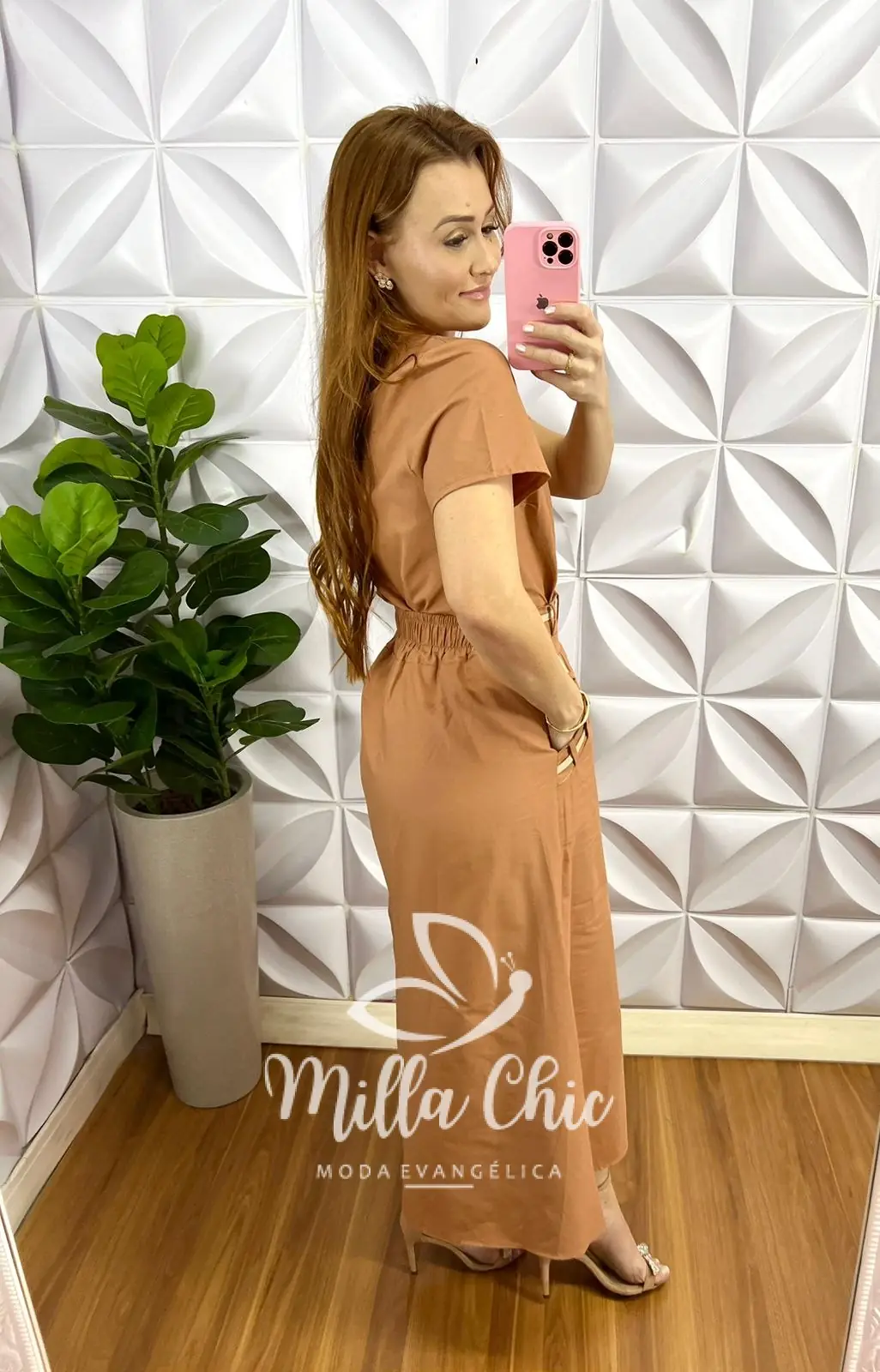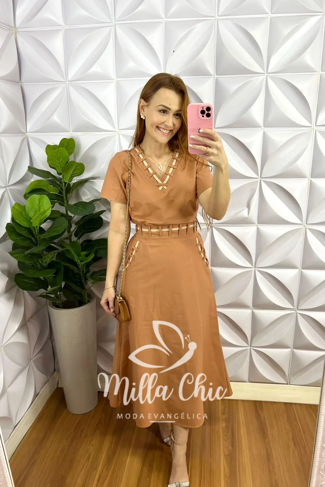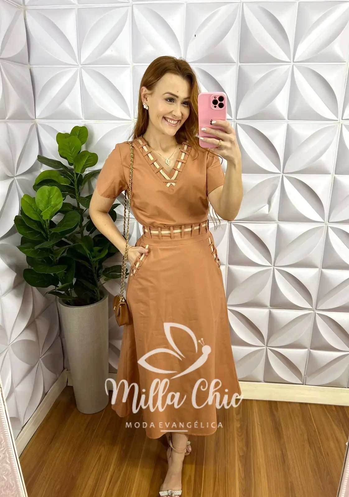 Conjunto Linho Com Detalhe Em Viés Mídi kelita - Capuchino - Milla Chic