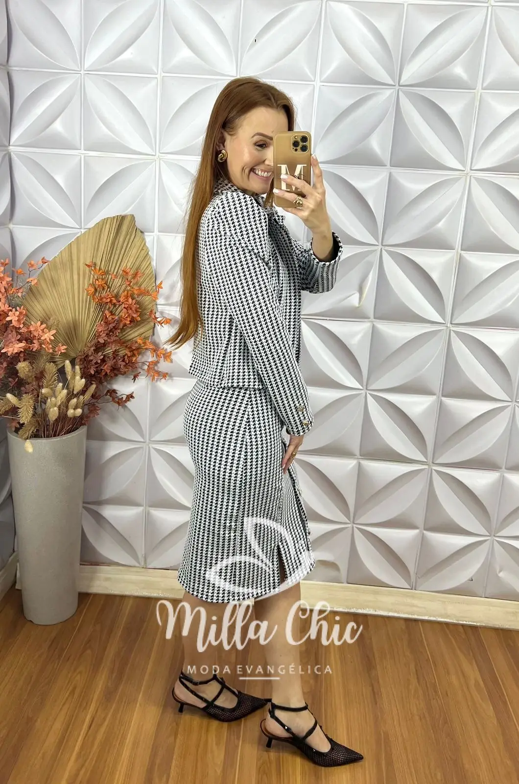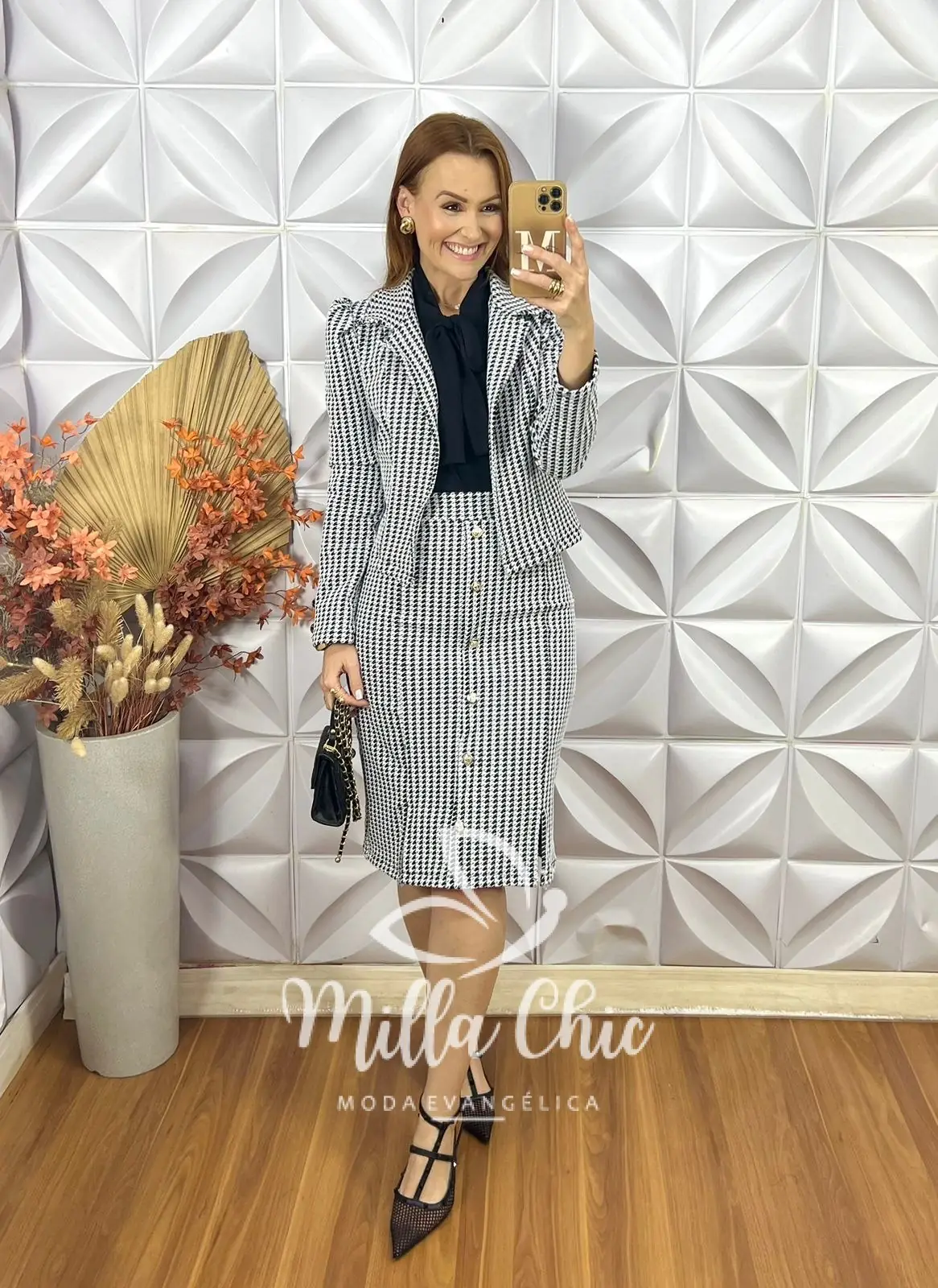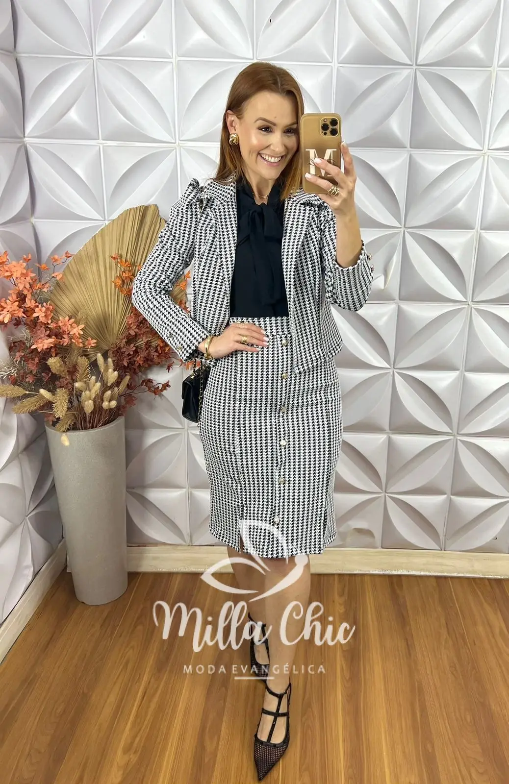 O conjunto luzia se destaca padronagem em pied poudle que é um clássico da moda e te deixa muito elegante .