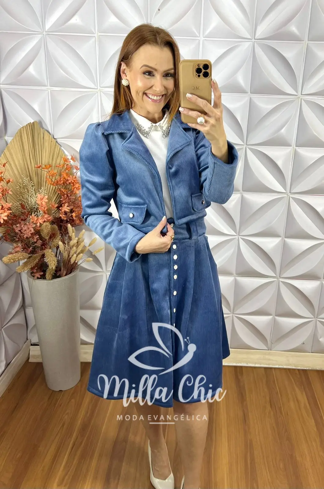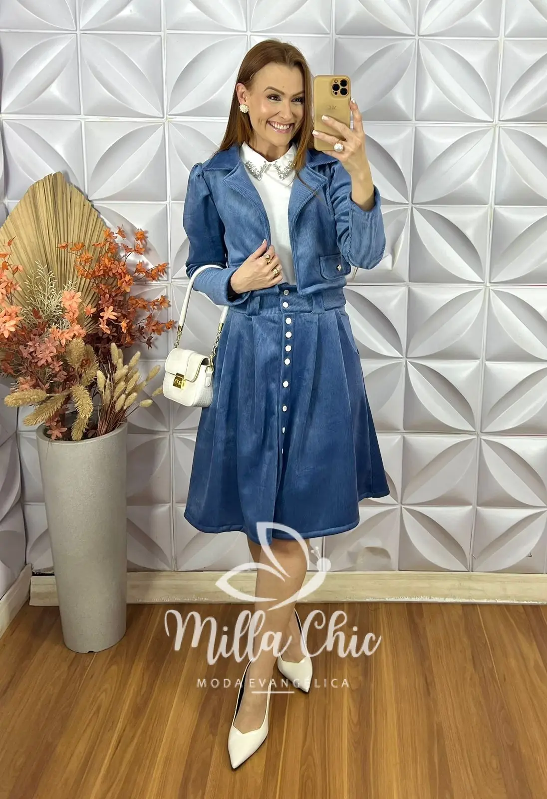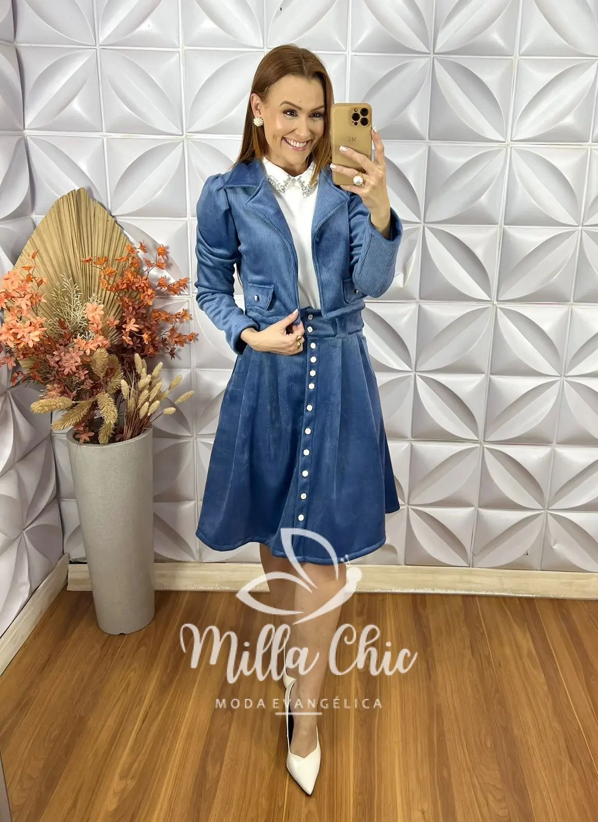 Aquele conjunto que vai te deixar muito elegante. O casaco na altura no coa da saia acompanha esse conjunto dando toda a sofisticação.