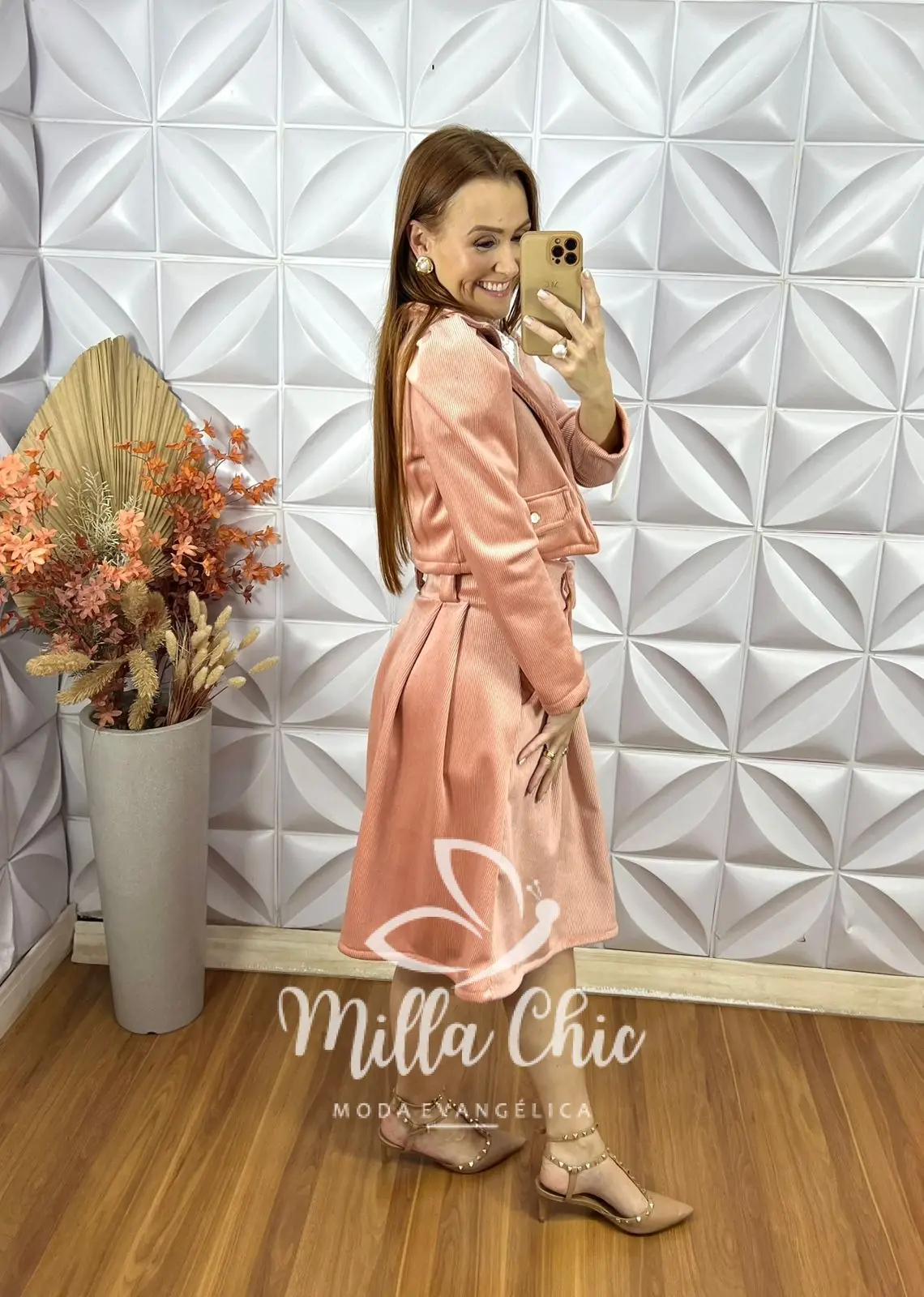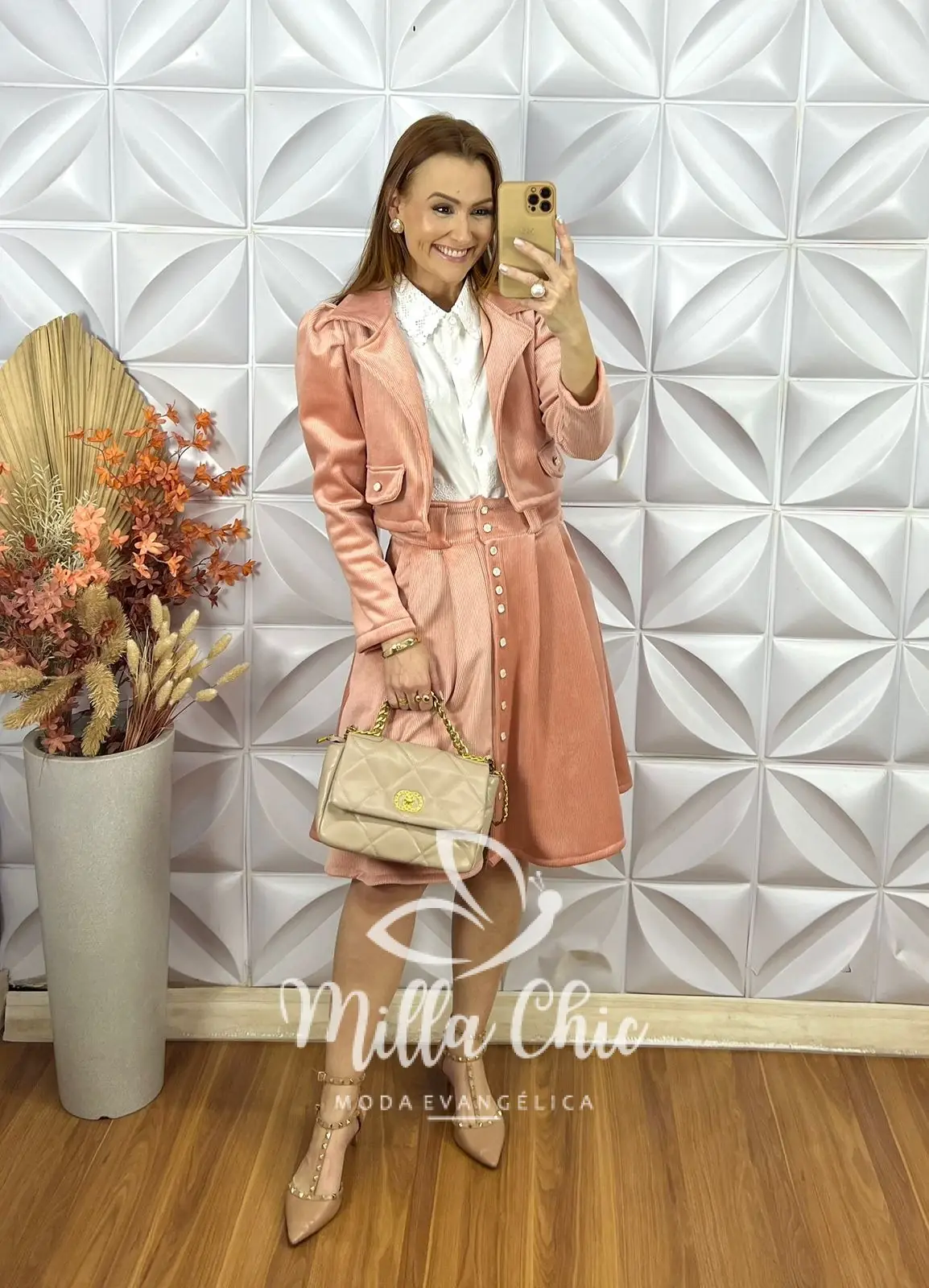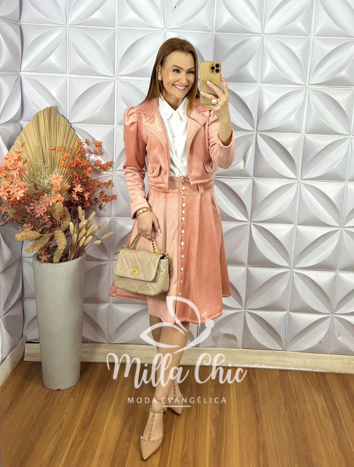 Aquele conjunto que vai te deixar muito elegante. O casaco na altura no coa da saia acompanha esse conjunto dando toda a sofisticação.