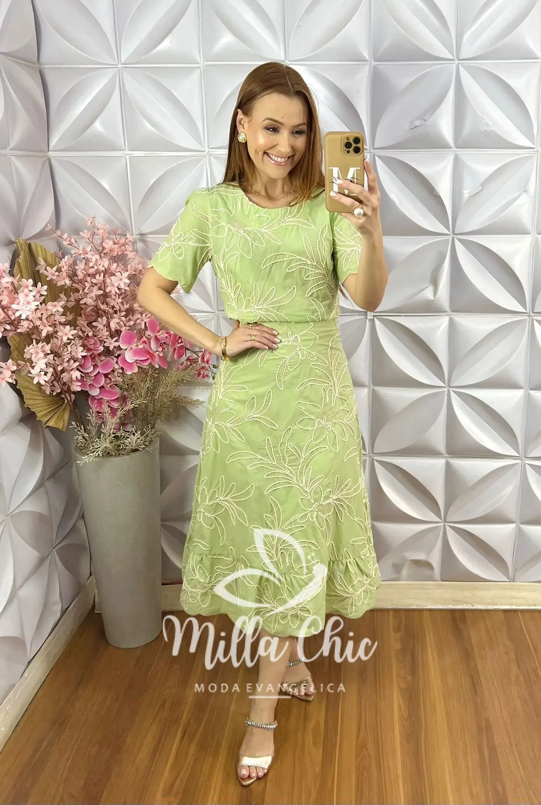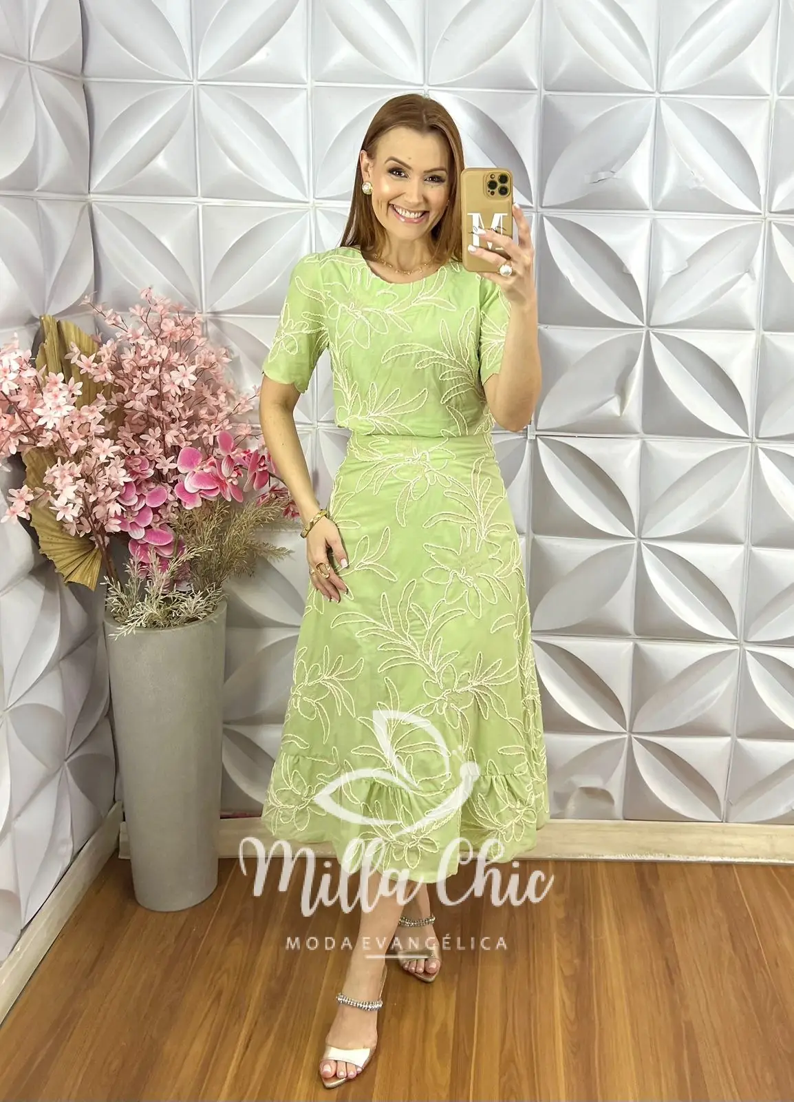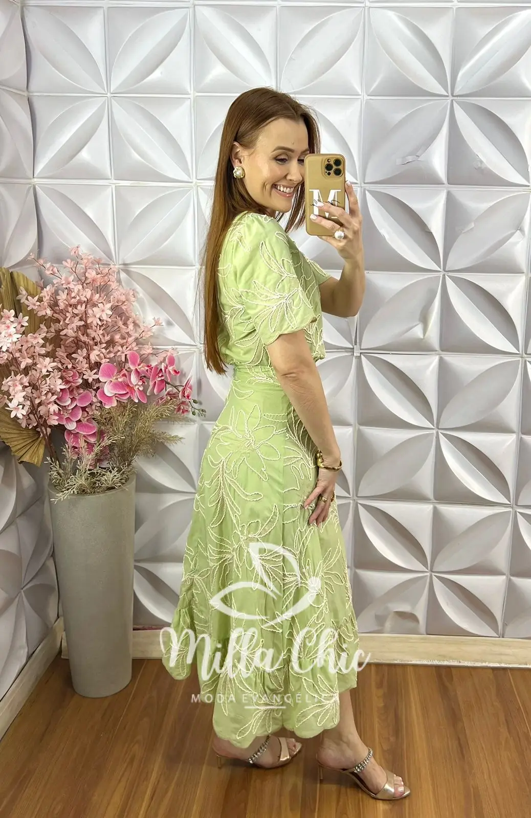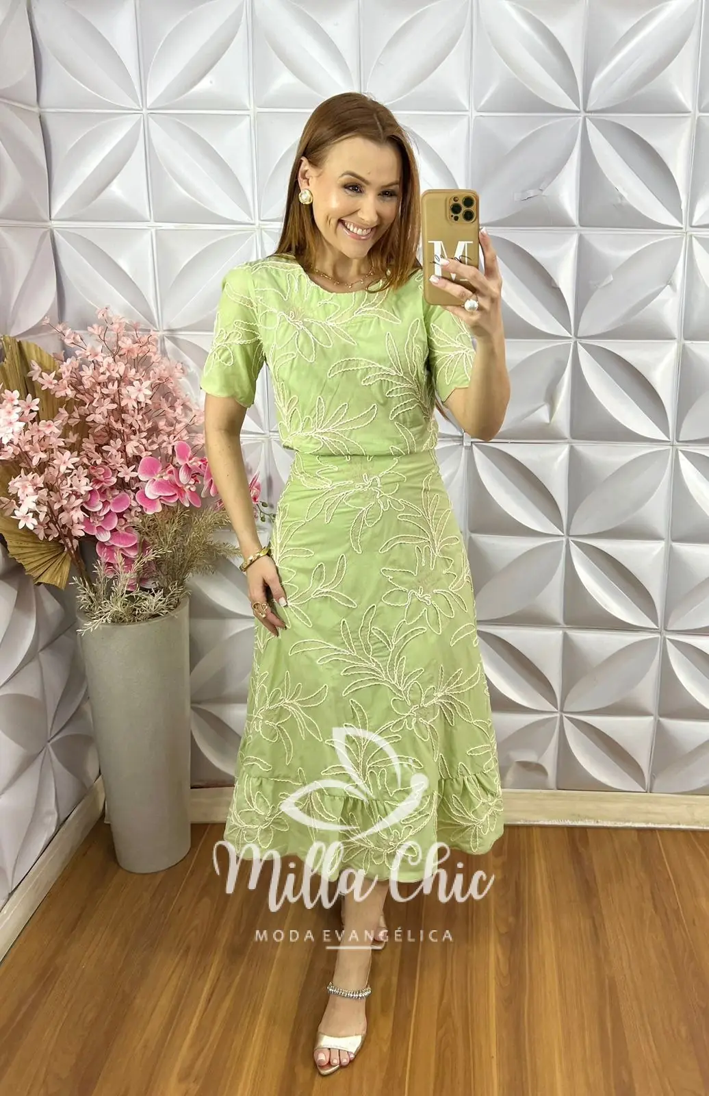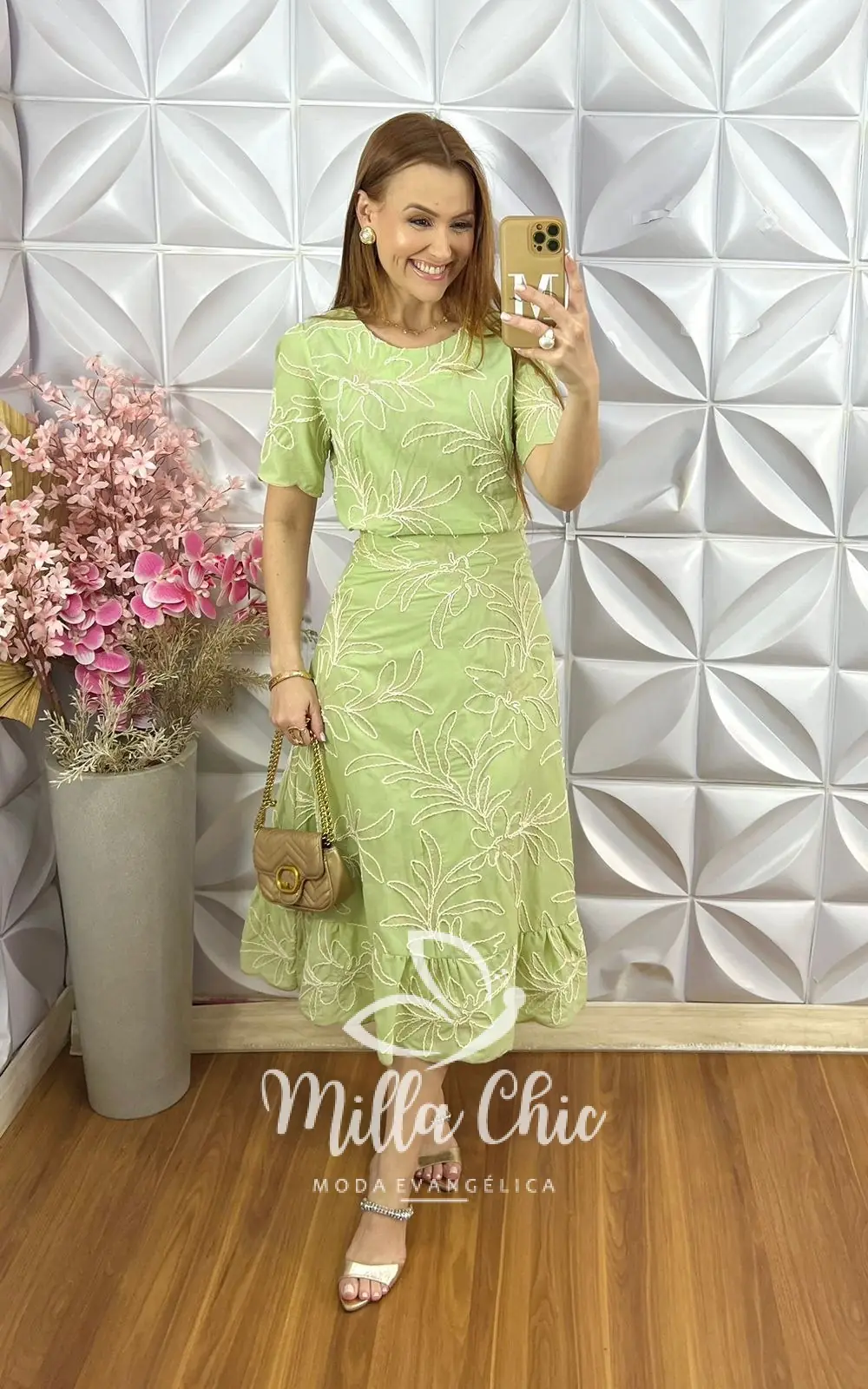 O conjunto Malu se destaca pelo tecido maravilhoso com bordados em cordonê .