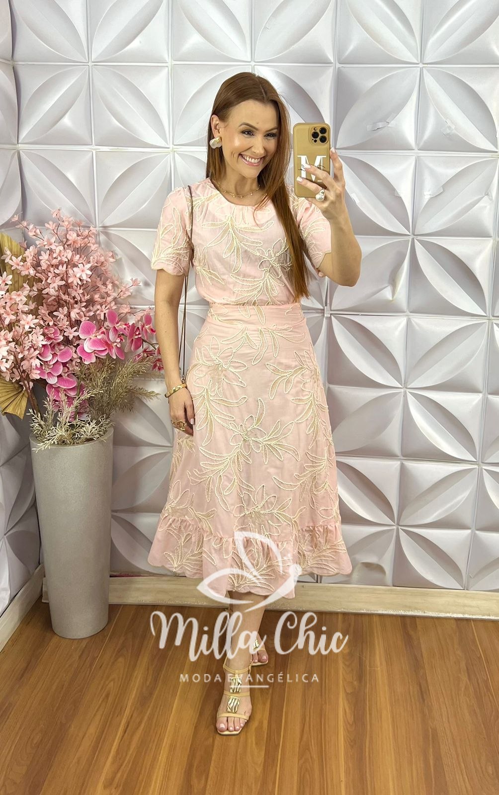 Conjunto Malu Em Bordado Cordonê - Rosa Pó - Milla Chic