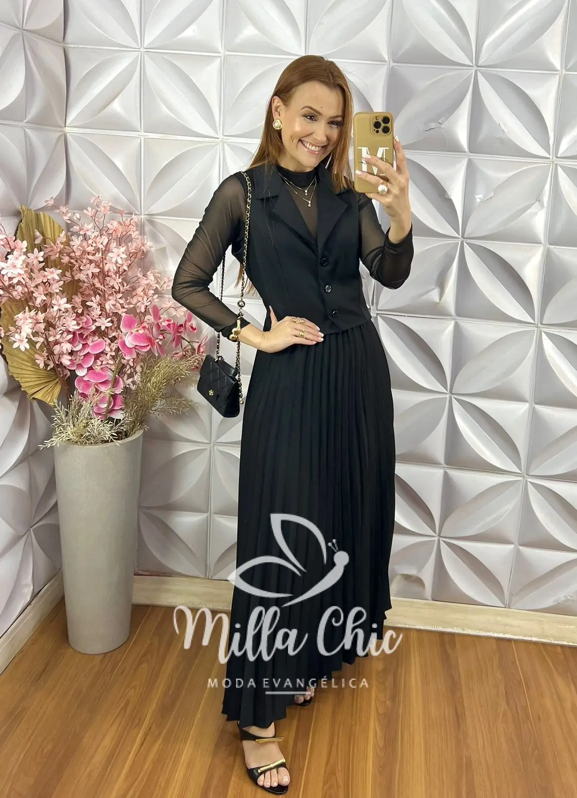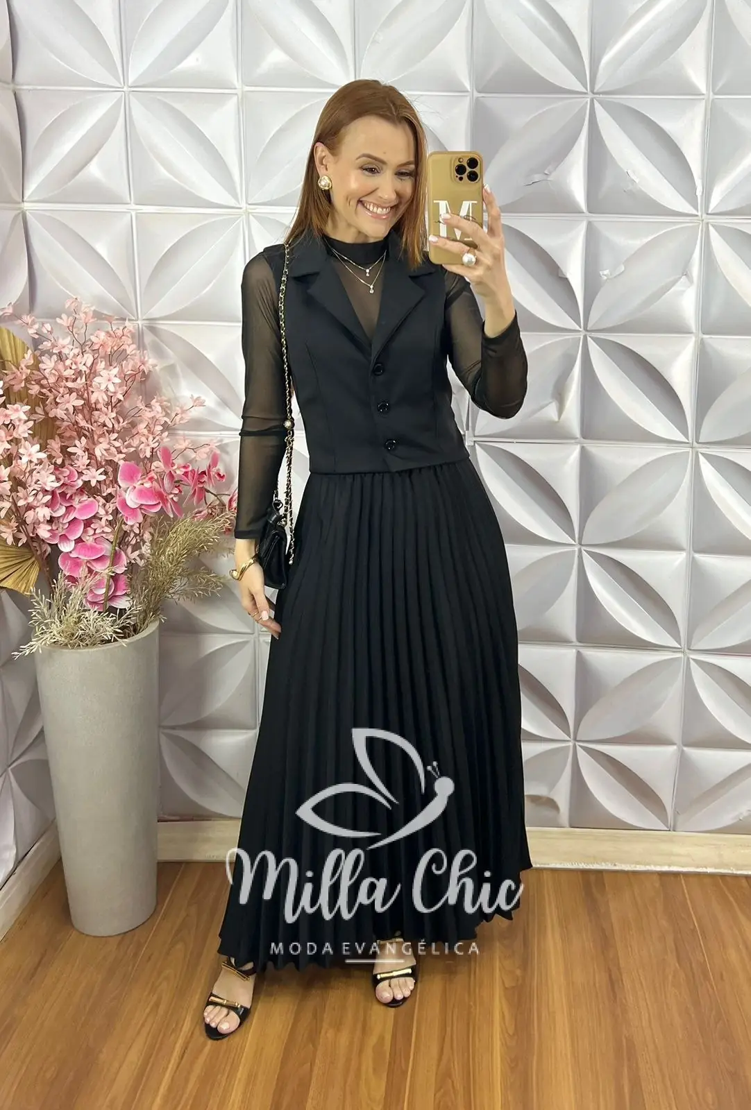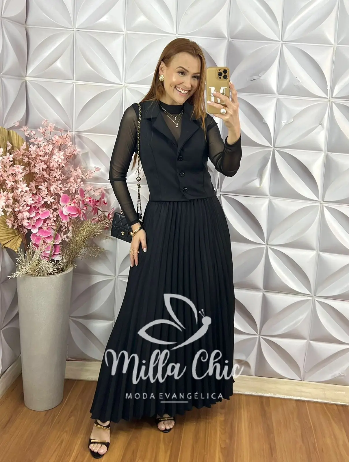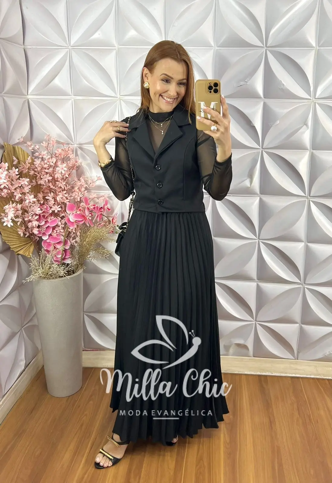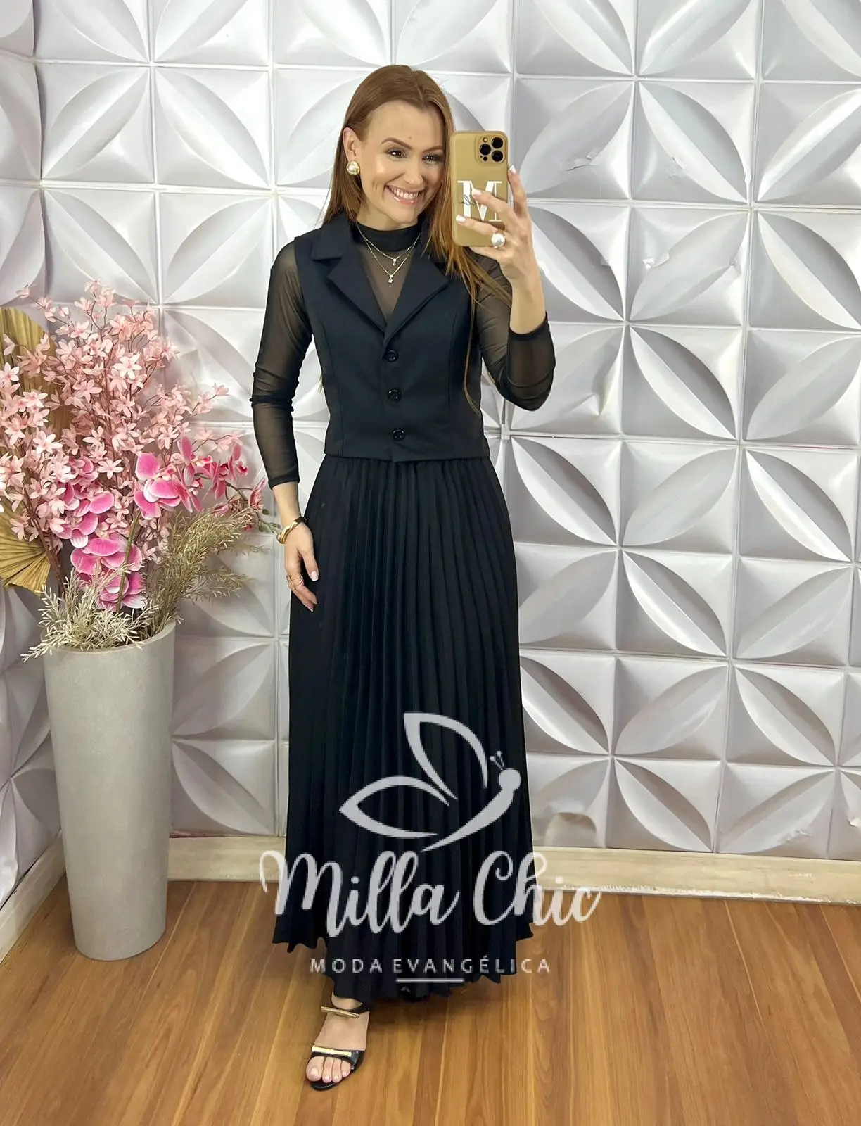O conjunto Maria Cecília se destaca pelo colete e a saia longa plissada . Uma saia clássica e estilosa . Essa saia plissada está com um caimento maravilhoso e vai te deixar linda e muito chic.
