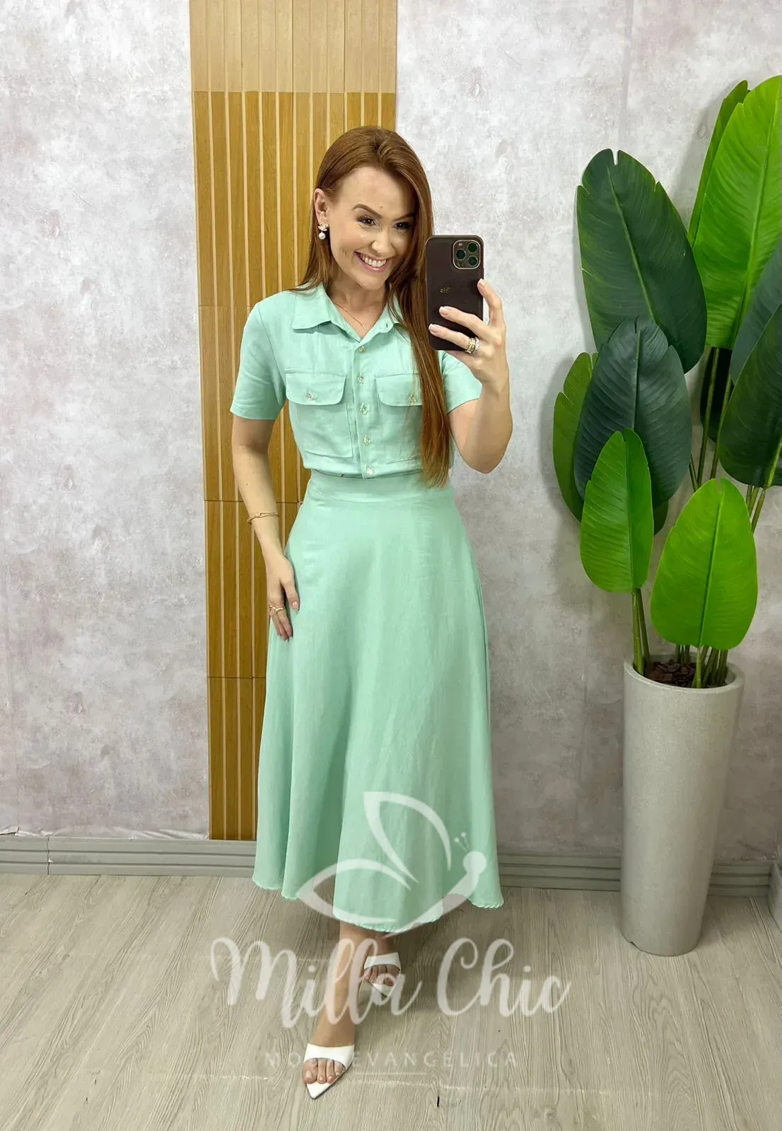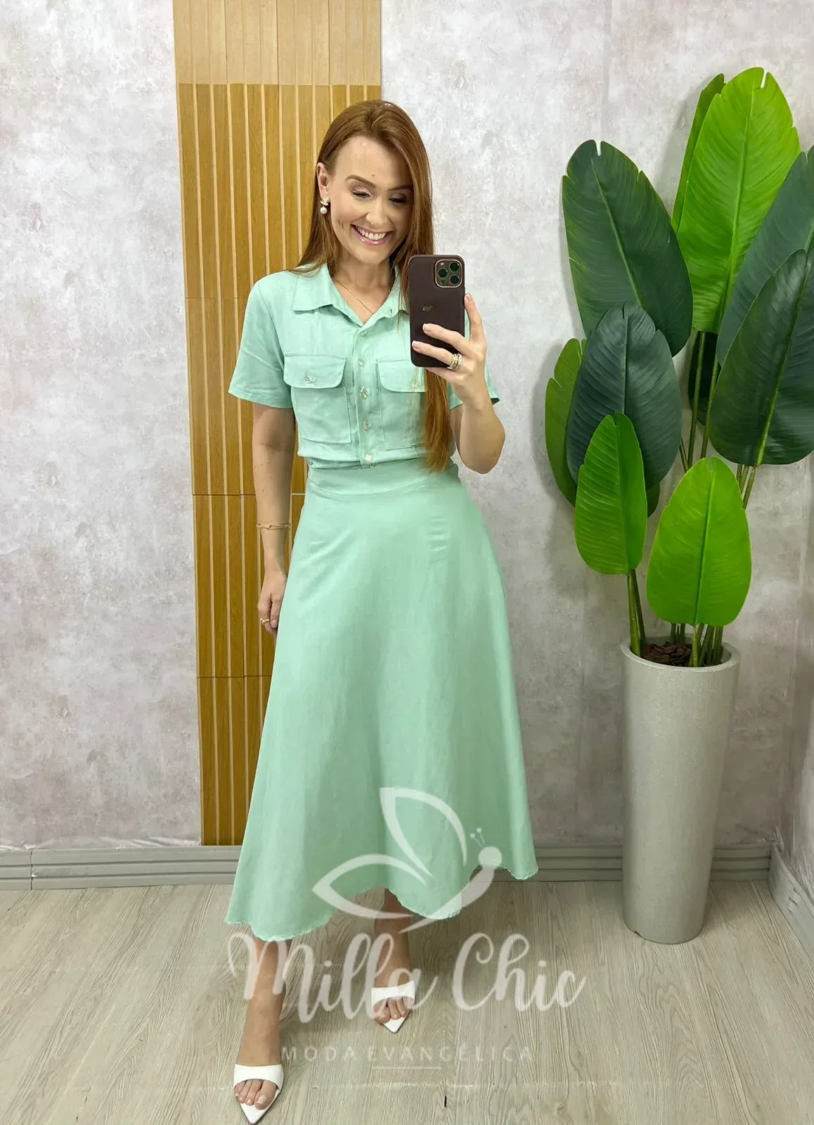 O conjunto Raiane se destaca pelos detalhes encantadores, como a modelagem da saia perfeita que valoriza e a camisa com botões funcionais e os bolsos funcionais com essa lapela .