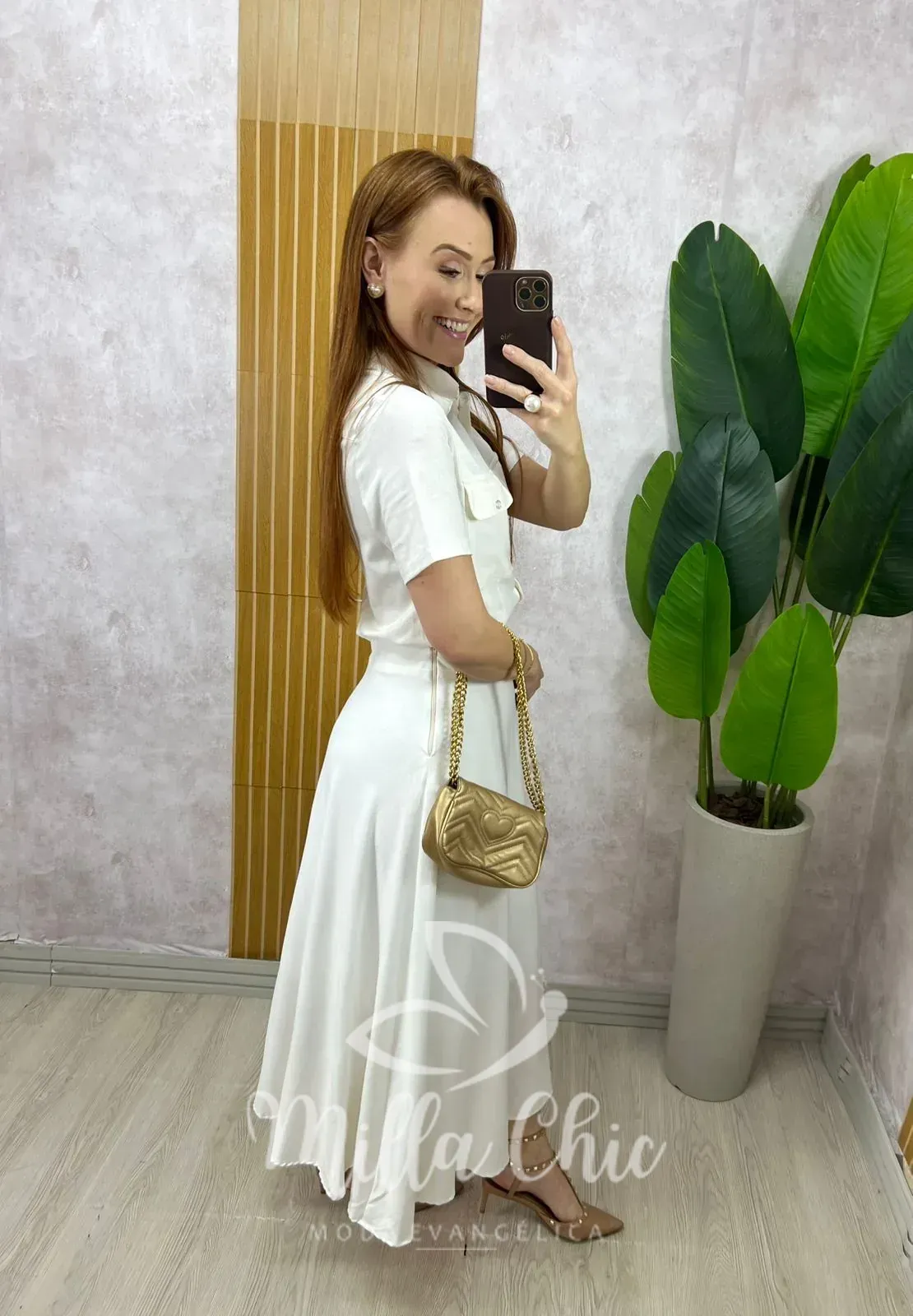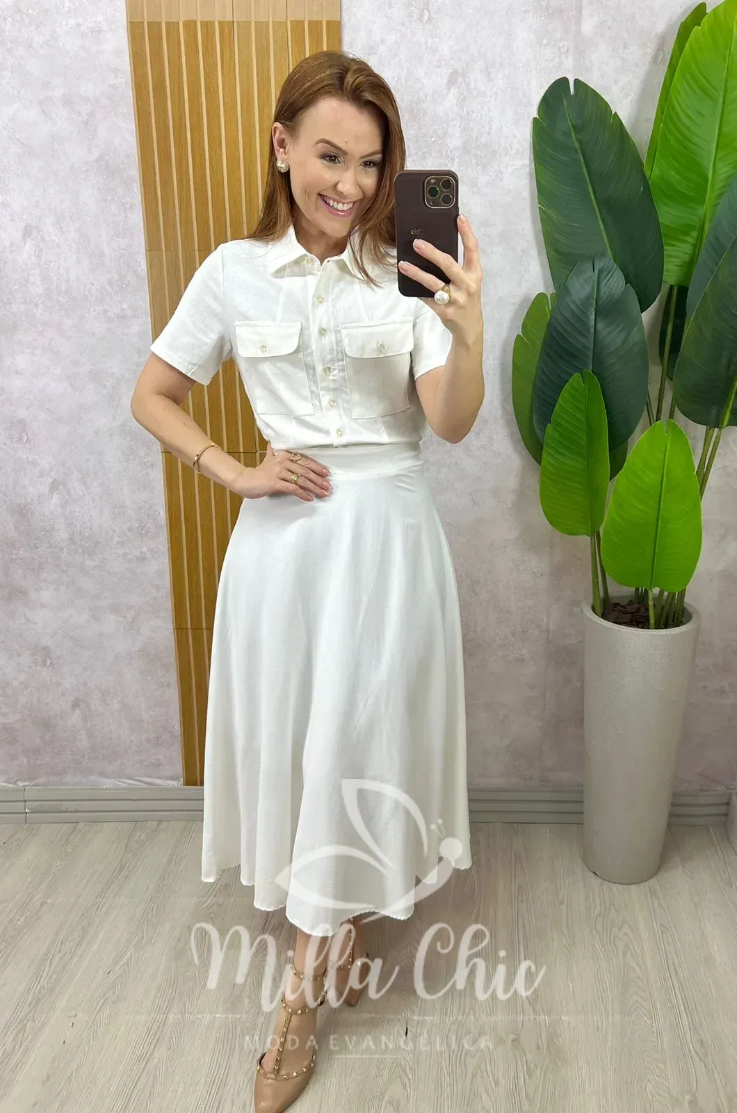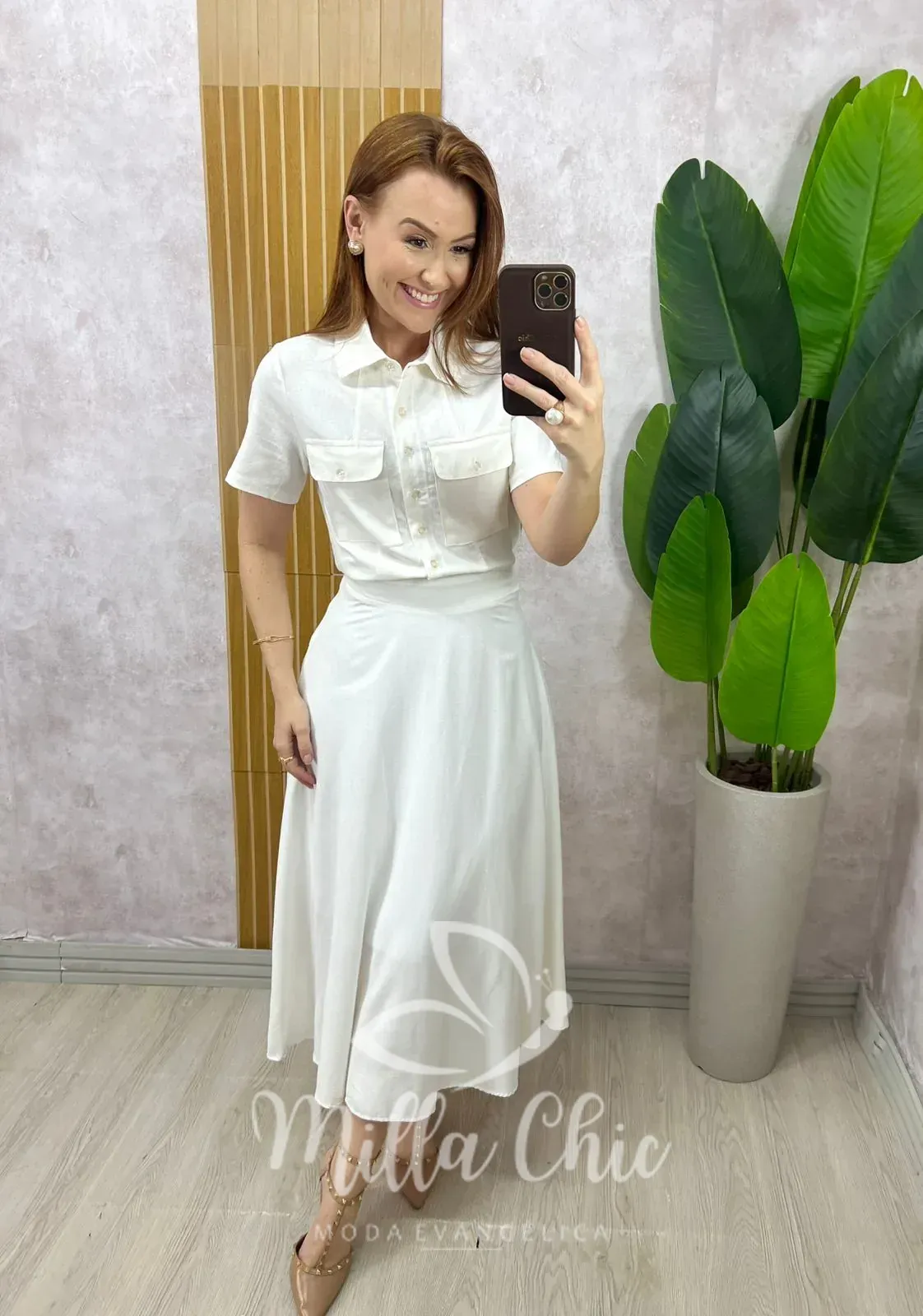 Composto pela camisa e a godê com o caimento perfeito . Comprimento midi ( chiquérrimo) zíper na lateral .