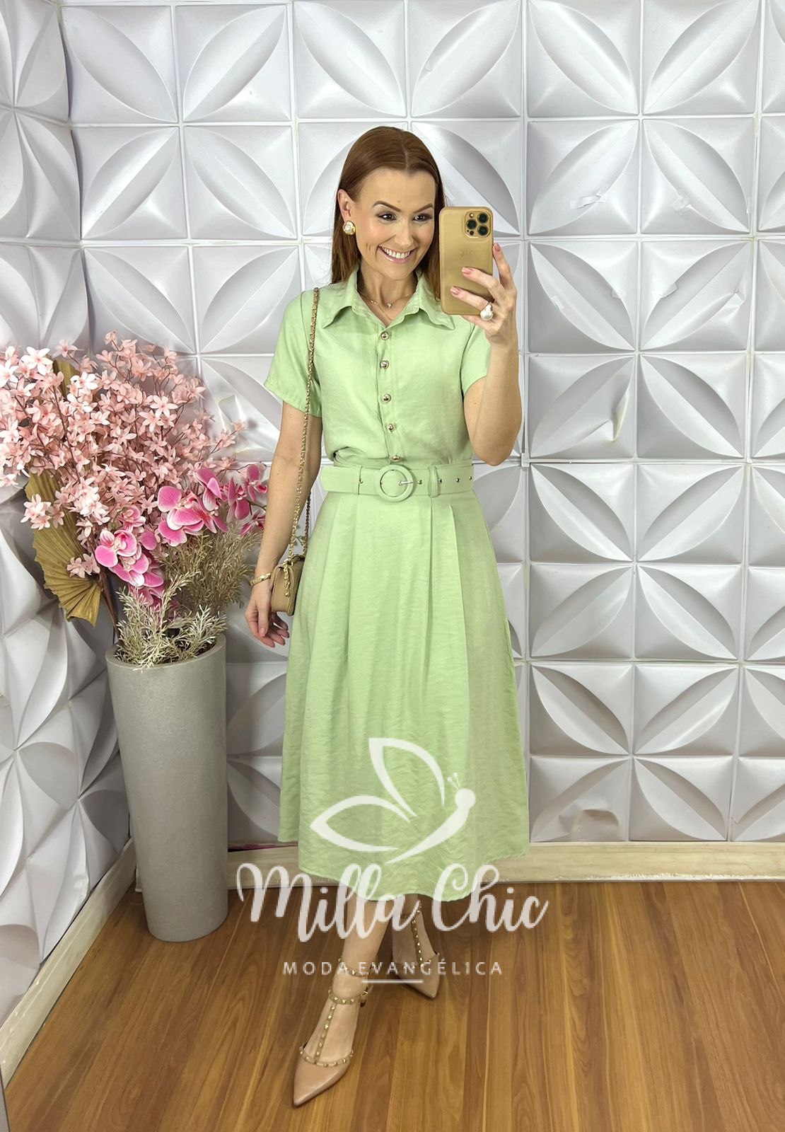 A saia é aquele modelo clássico godê com pregas frontais midi e com uma modelagem perfeita . O toque exclusividade e sofisticação desse conjunto é o cinto encapado no mesmo tecido da saia.
