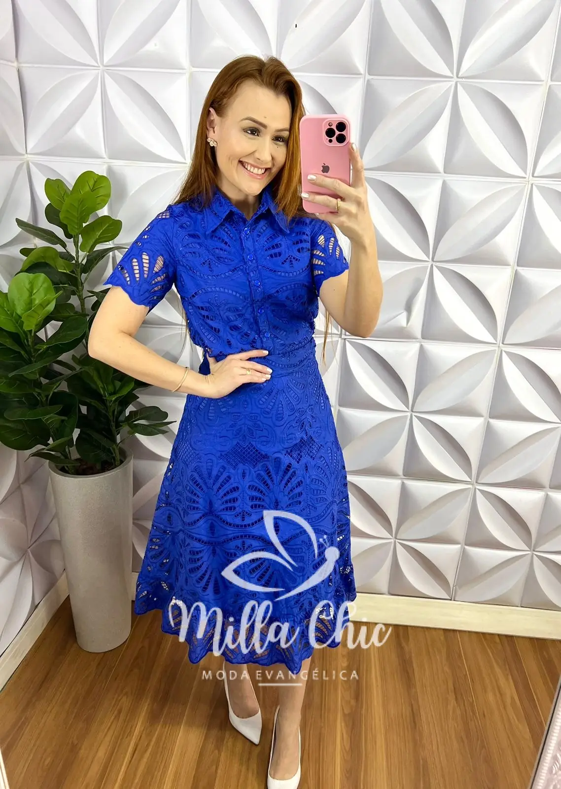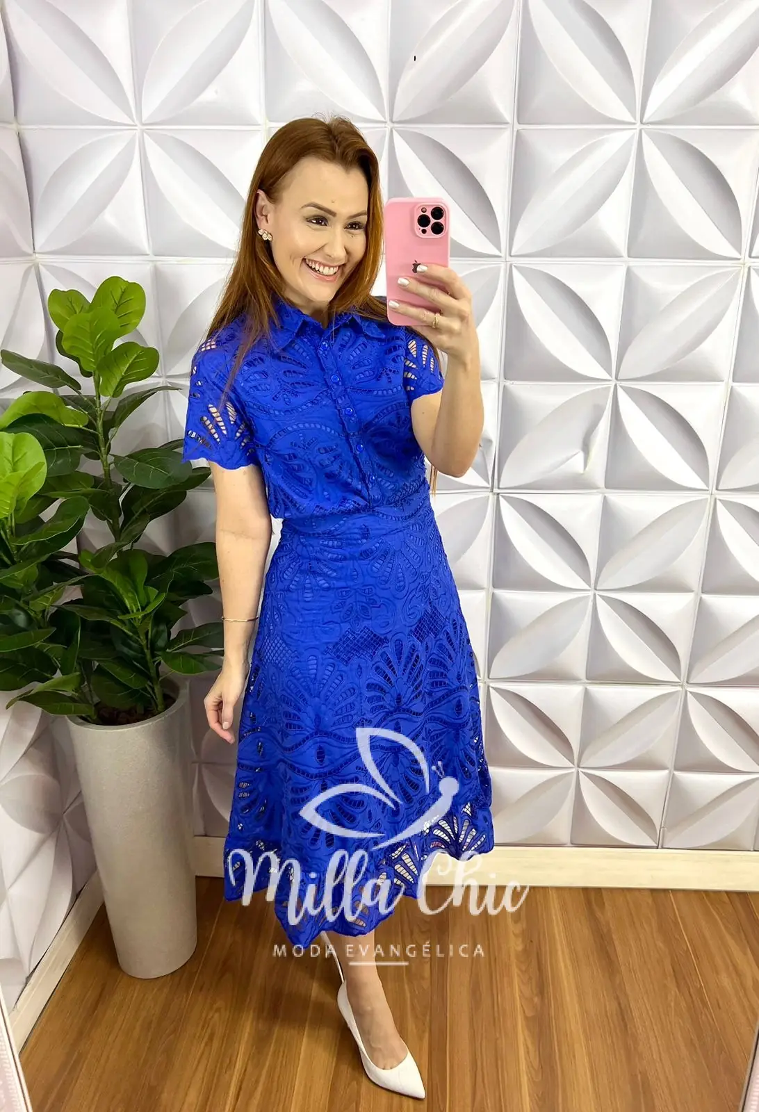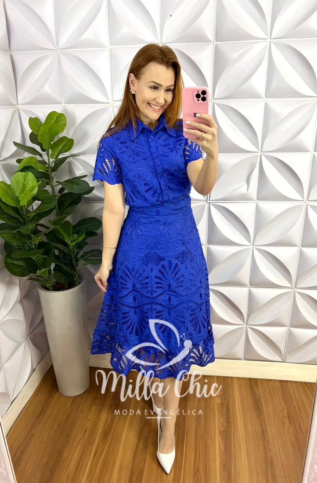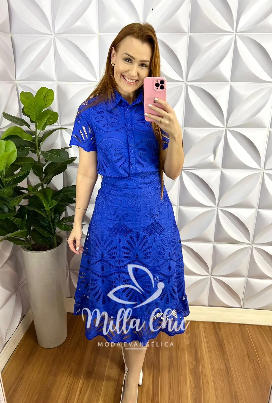 A Camisa Toda forrada, com gola, todo de botões (funcional), manga com transparência, comprimento ideal. Saia com zíper nas costas, pala na cintura, caimento evase, com detalhe na barra, comprimento mídi, toda forrada.