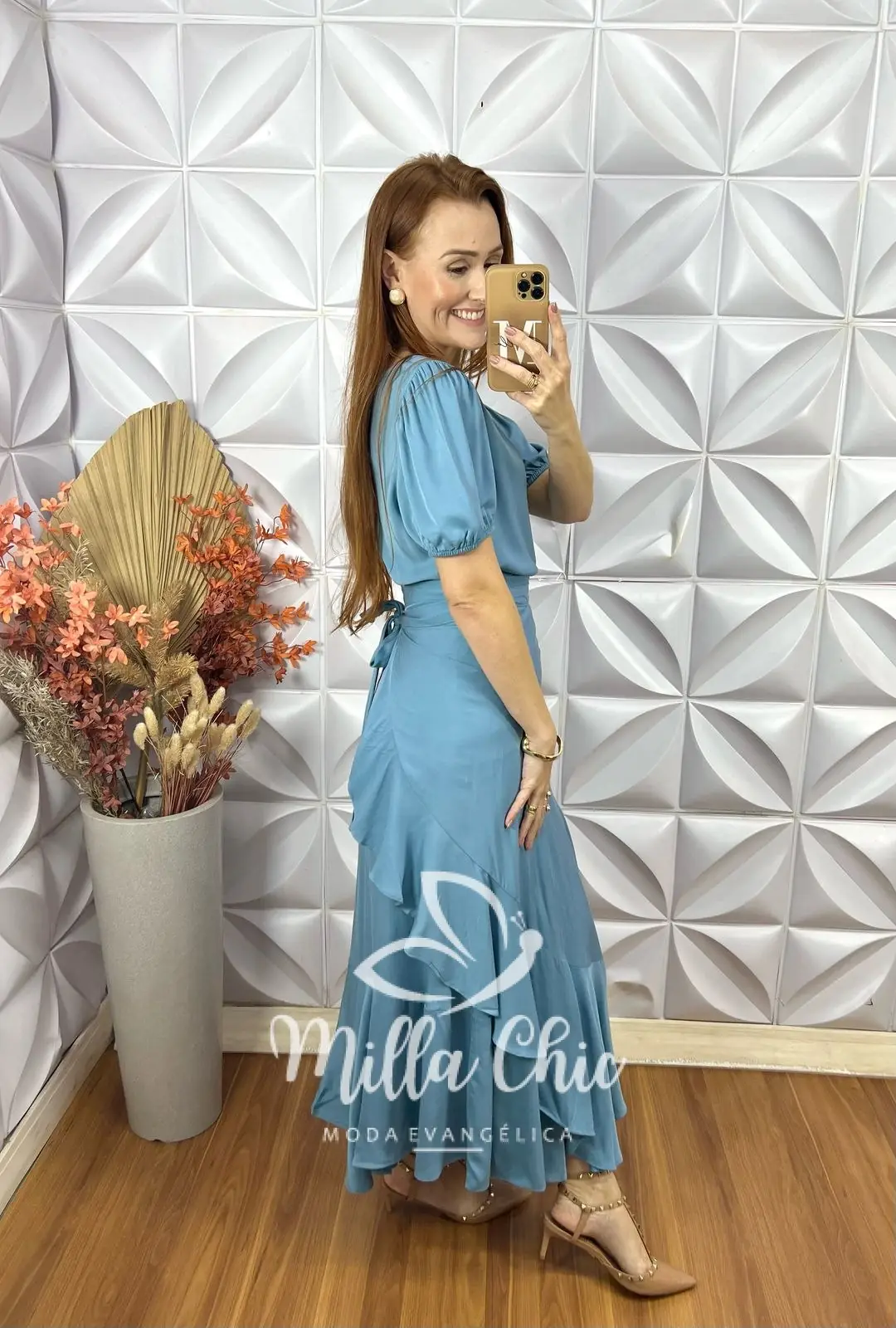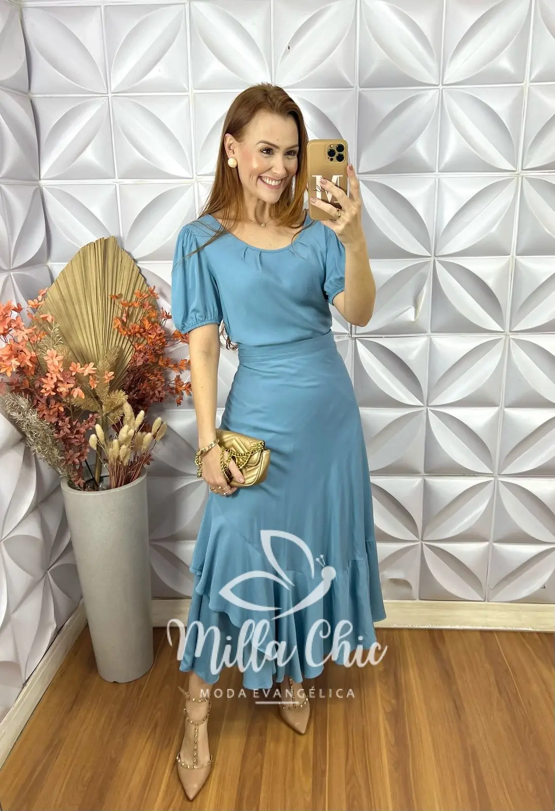 A saia é modelo envelope . É maravilhosa pois se adapta no corpo . Comprimento midi e esse detalhe de babado que deu um charme imensurável.