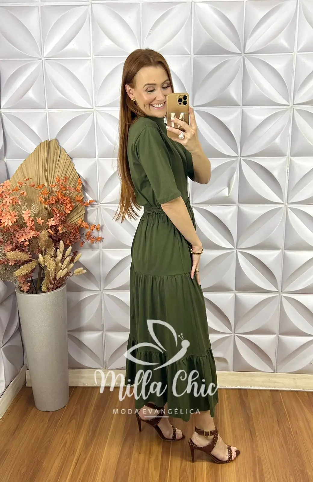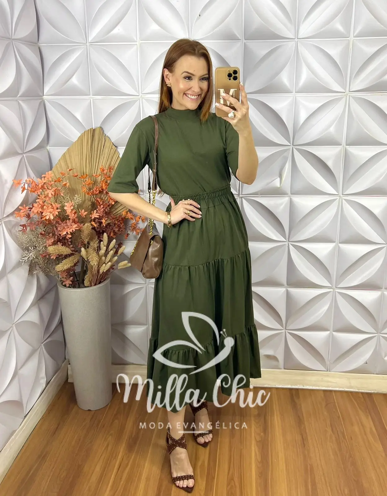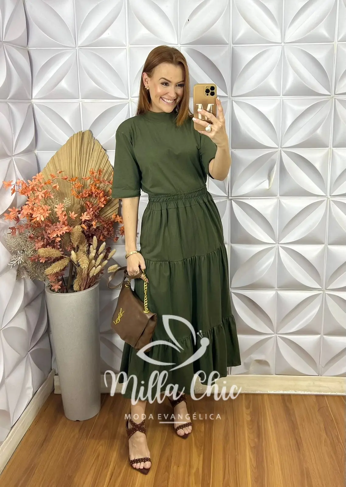 A saia tem elástico na cintura que traz essa casualidade e conforto e fica bem acinturada.