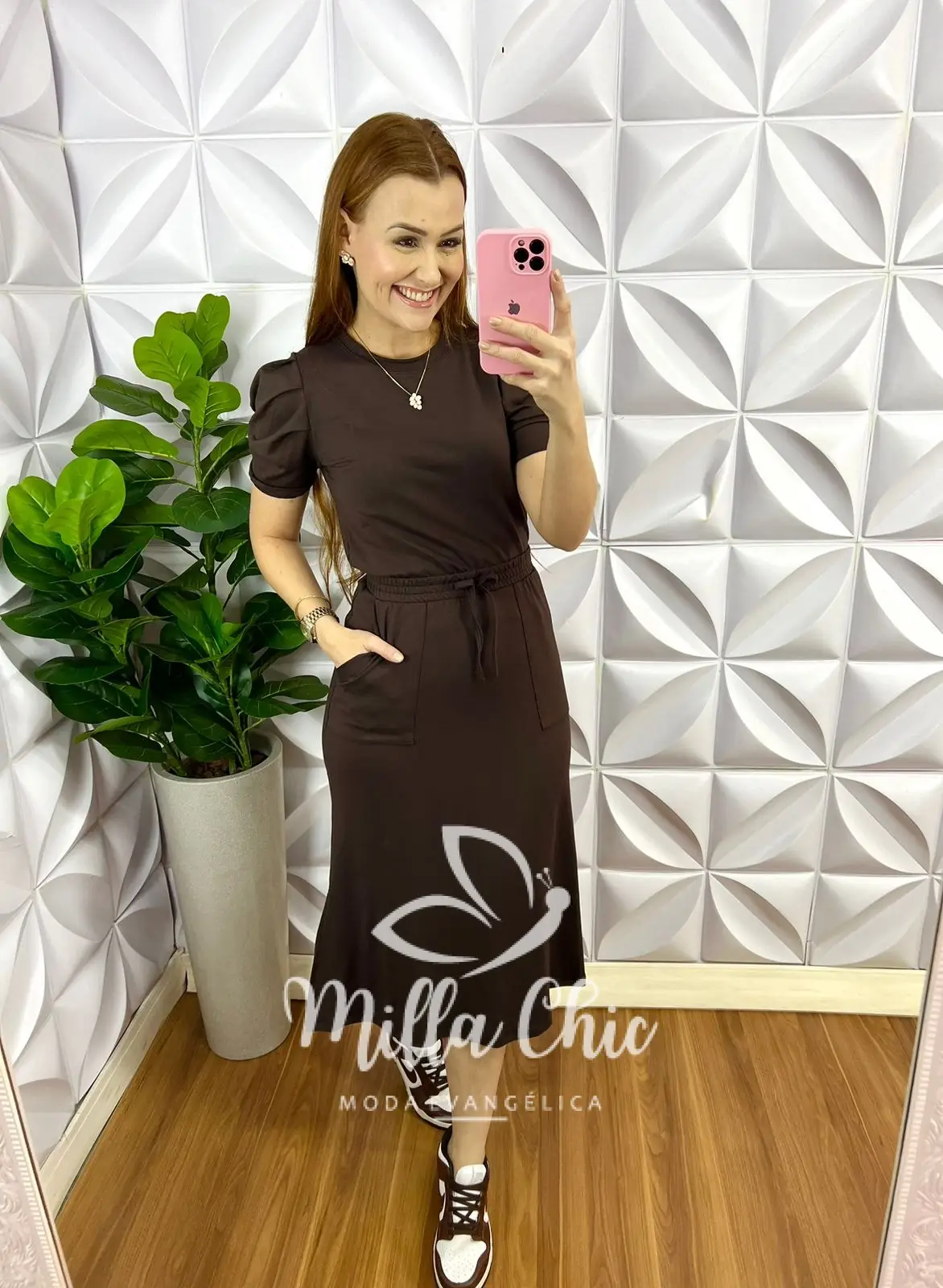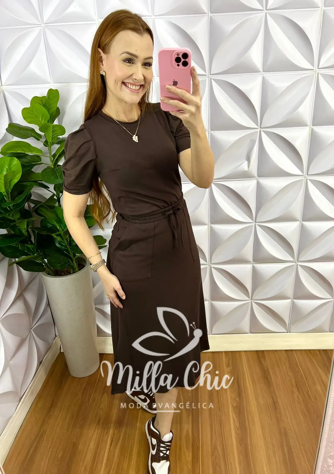 Conjunto Tecido Moletinho Manga Princesa Saia Mídi Melissa - Marrom - Milla Chic