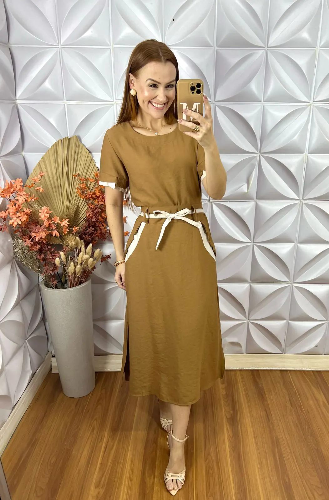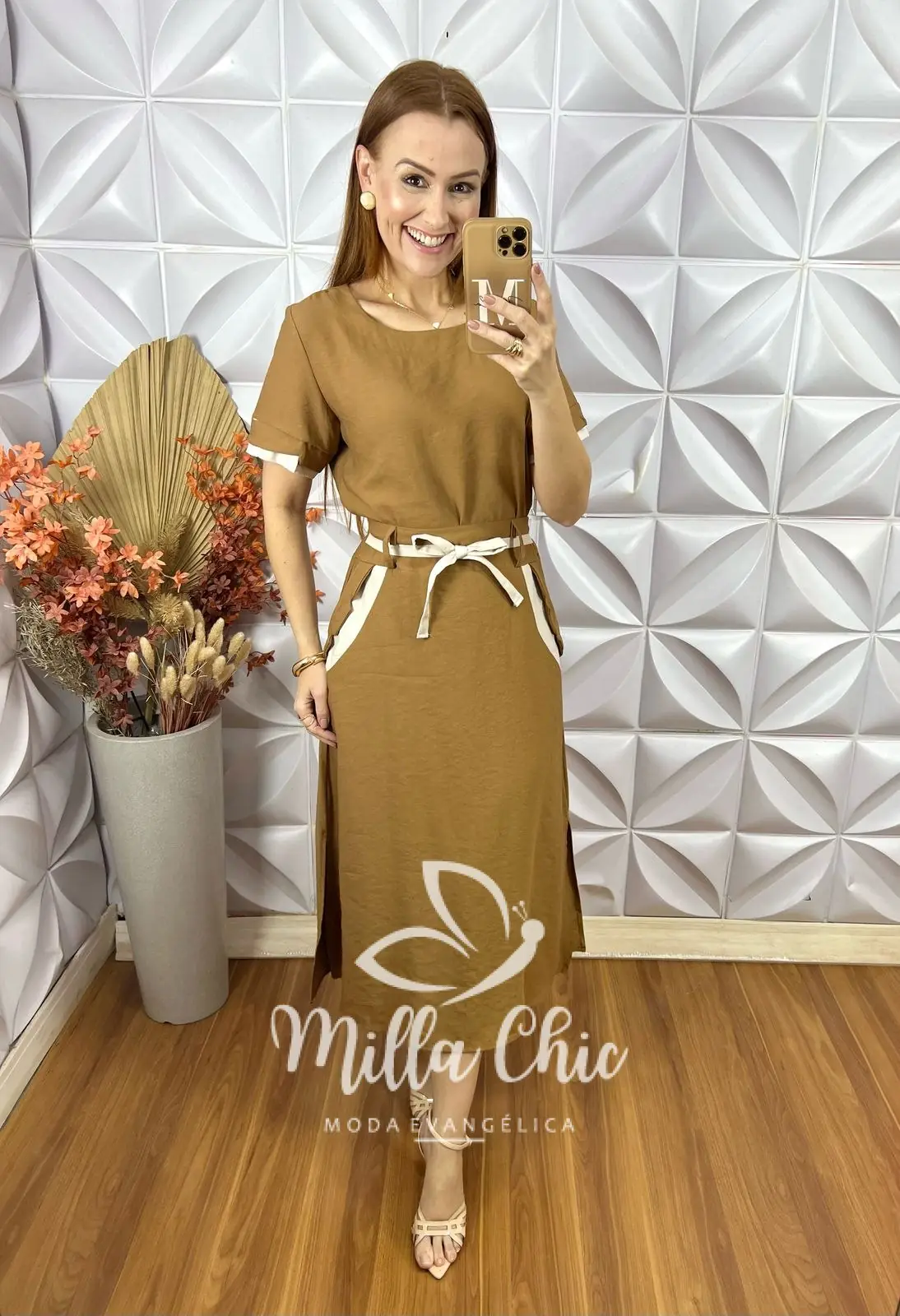 Os detalhes do cinto e bolso em outra cor só tecido deixou esse conjunto um espetáculo de elegância . Solta ,muito confortável e com elástico na cintura só na parte das costas . Comprimento midi e fendas laterais que dão muito charme a ela .