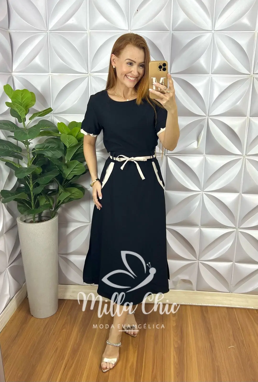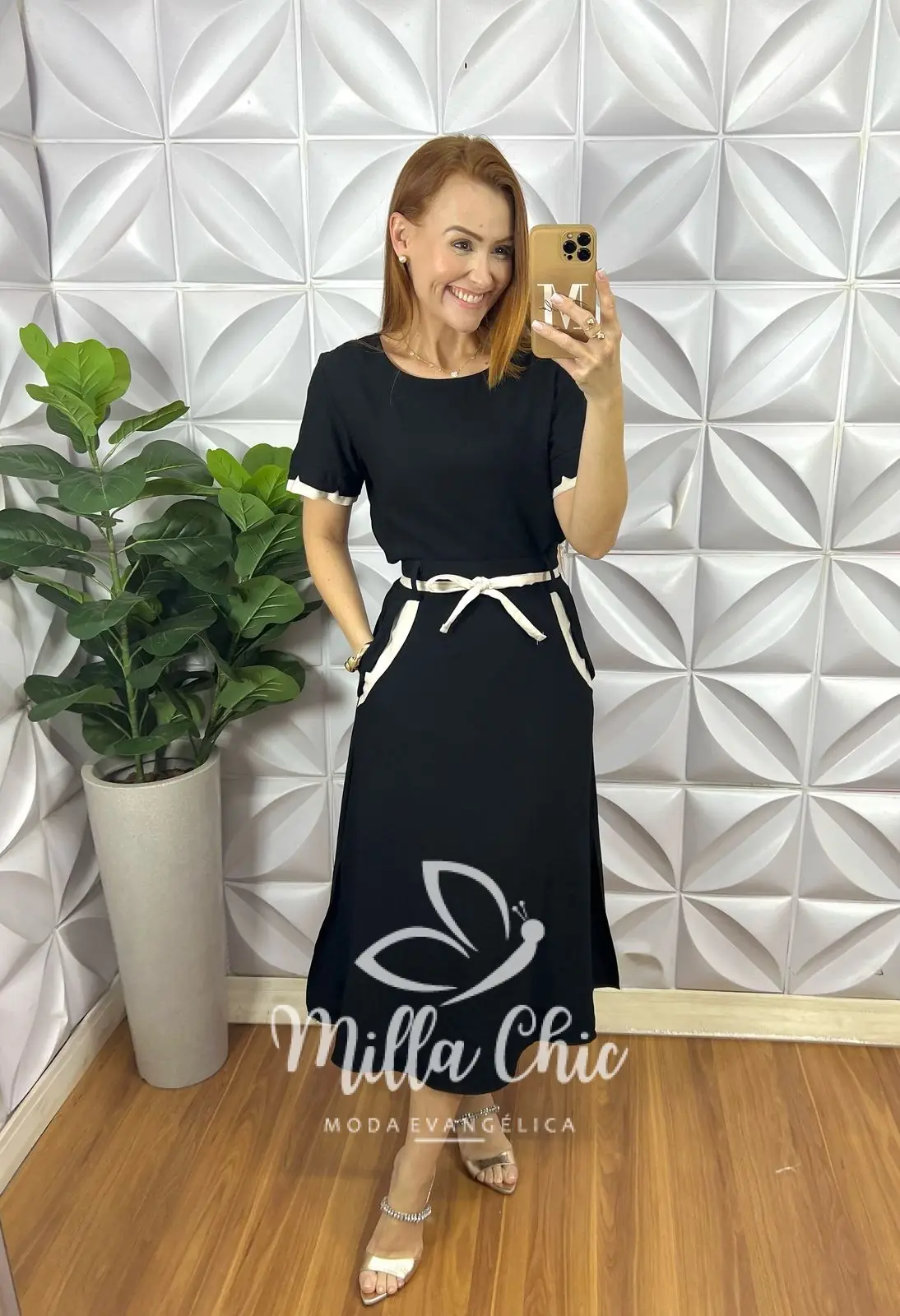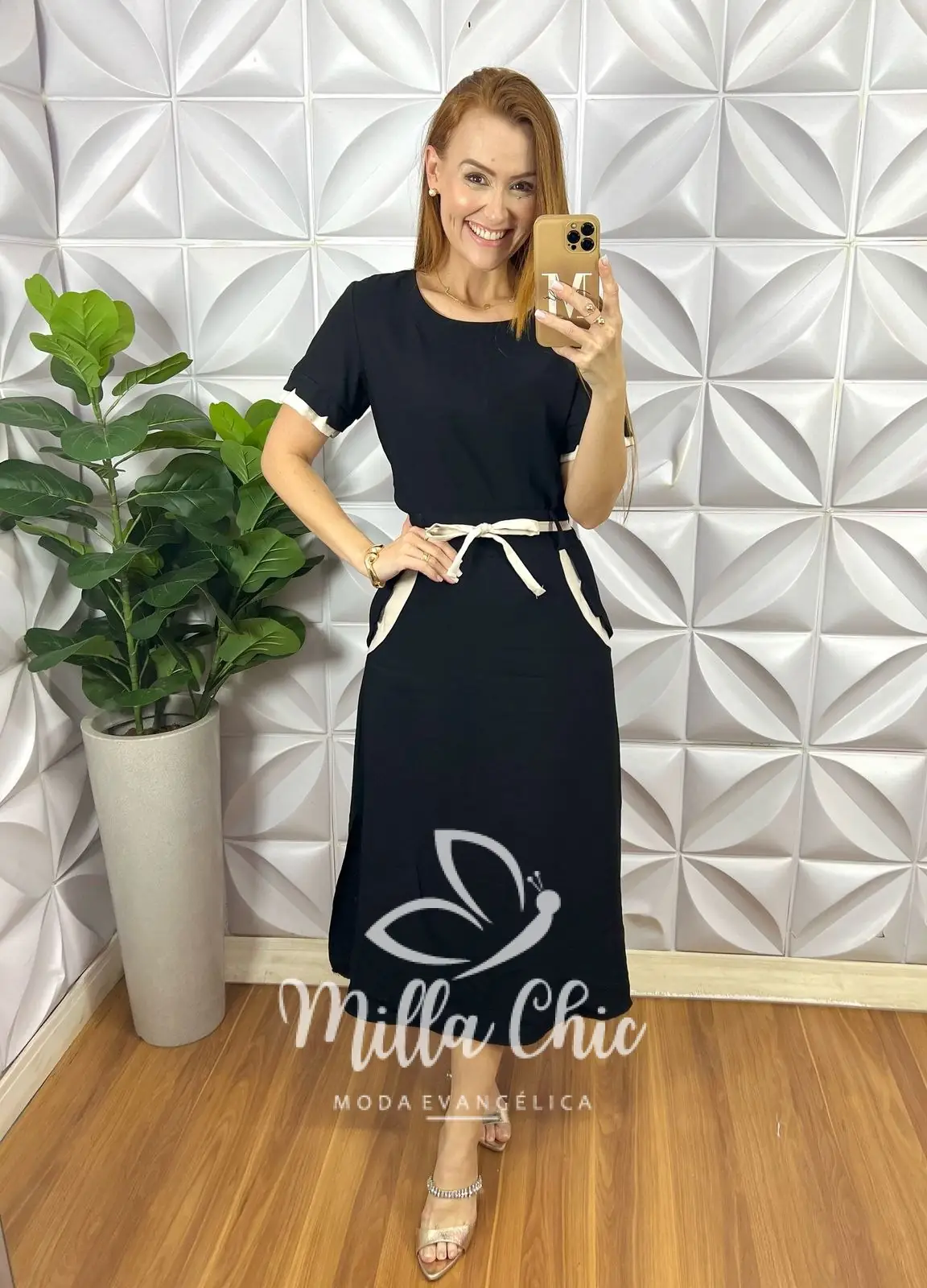 Os detalhes do cinto e bolso em outra cor só tecido deixou esse conjunto um espetáculo de elegância . Solta ,muito confortável e com elástico na cintura só na parte das costas . Comprimento midi e fendas laterais que dão muito charme a ela .