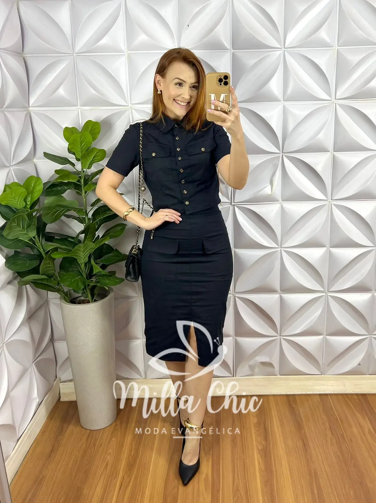 Conjunto Tricoline 100% Algodão Blusa Casaquinho Com Bolsos Saia Mídi Tubinho Luiza – Preto