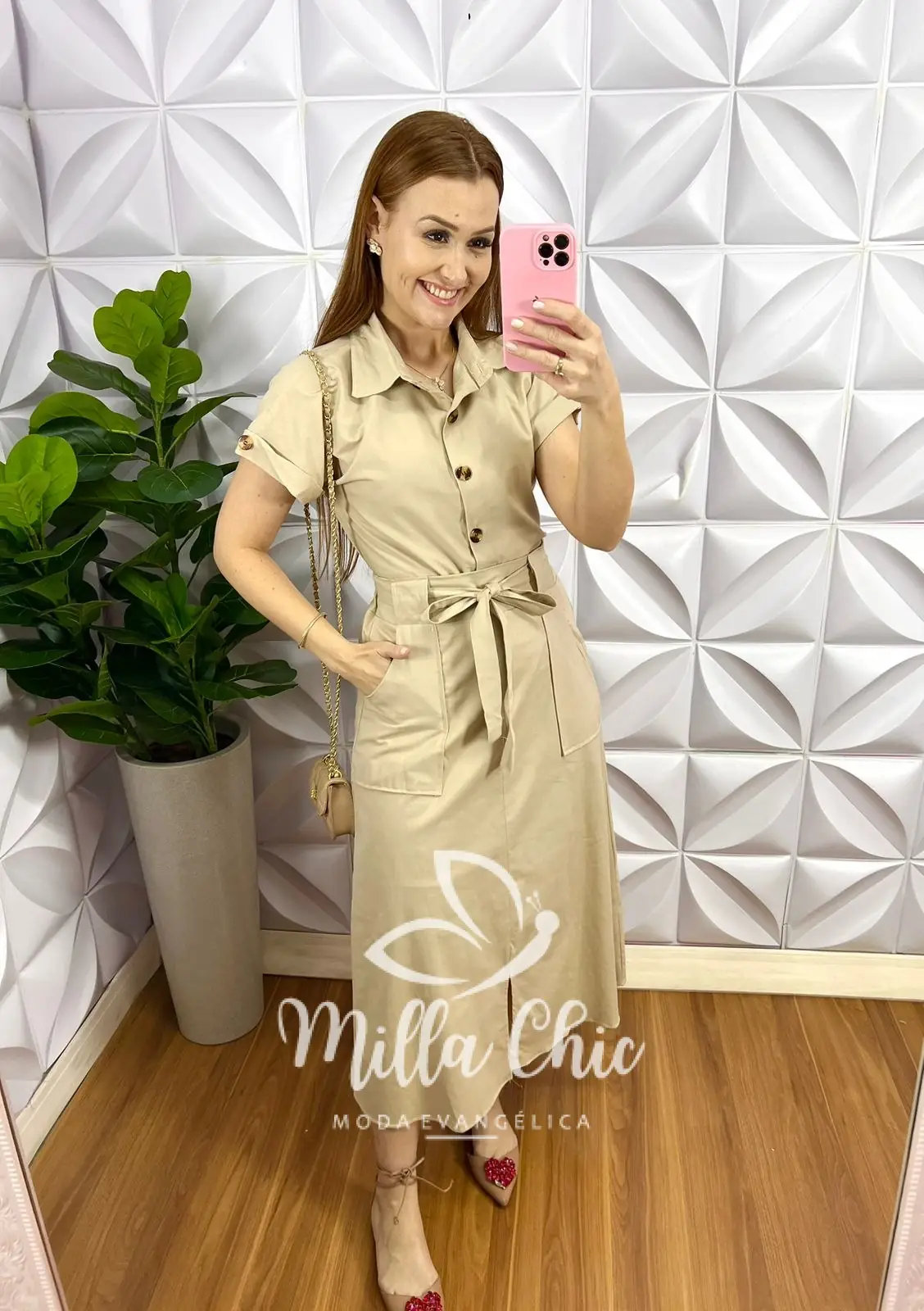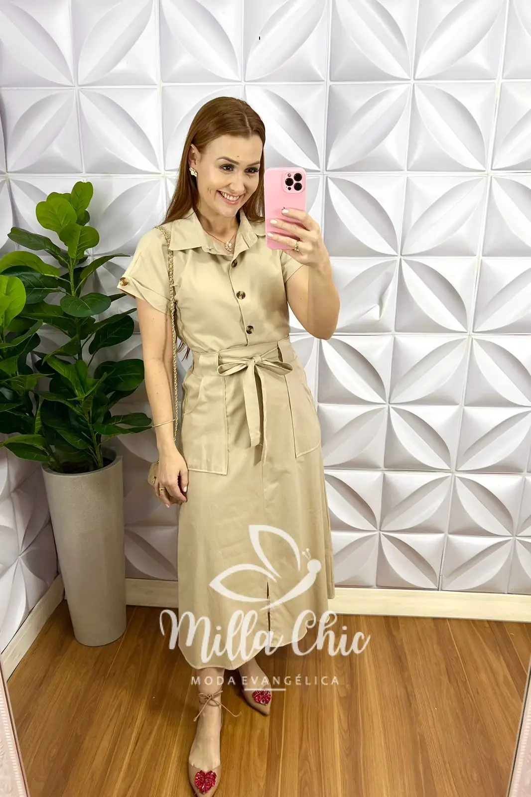 A Camisa com gola, Decote V, manga larguinha com barra dobrada e botão, com botões tartaruga funcionais, comprimento ideal. Saia com lastex na cintura na parte de trás vestindo super bem, bolso nas laterais, caimento evase, comprimento mídi leve fenda frontal. Acompanha cinto faixa.