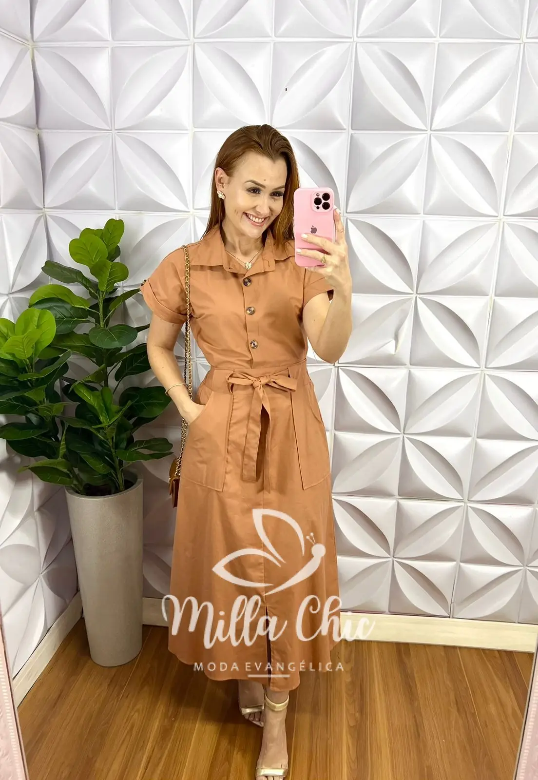 Conjunto Tricoline De Algodão Com Camisa E Saia Mídi Paula - Capuchino - Milla Chic
