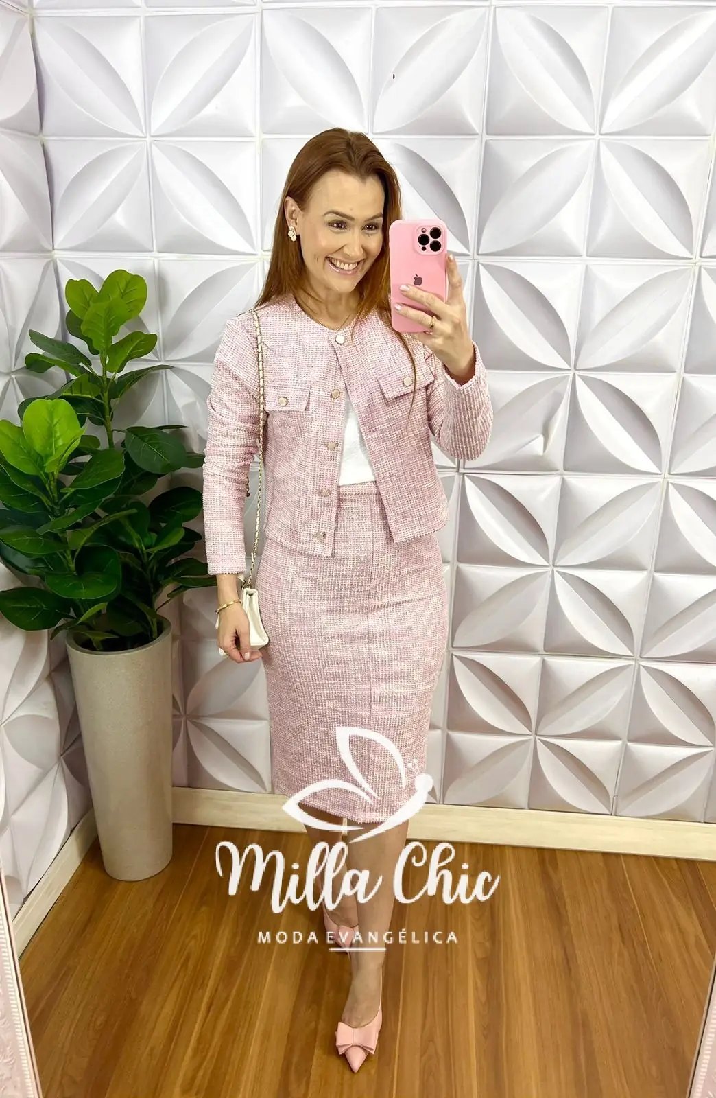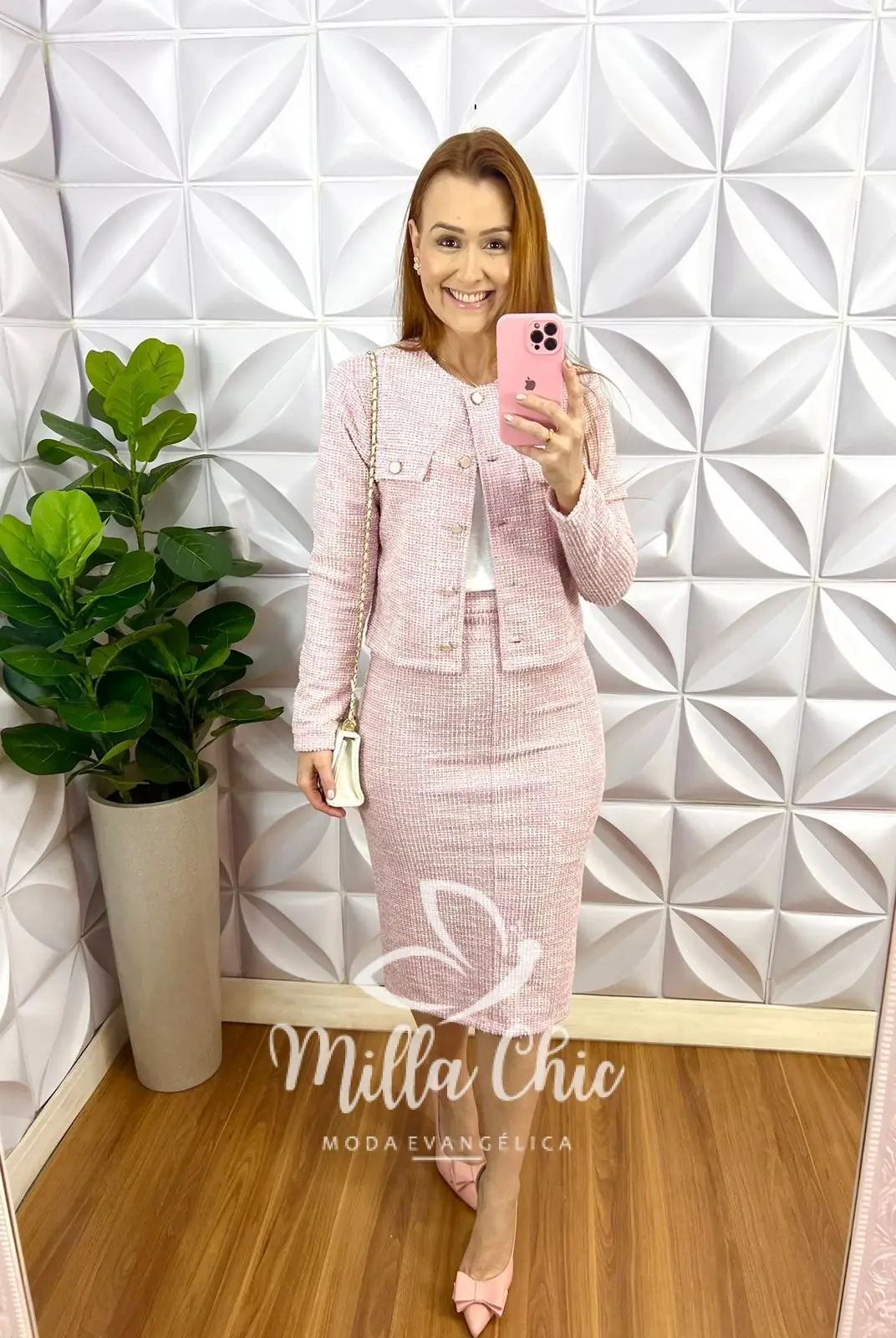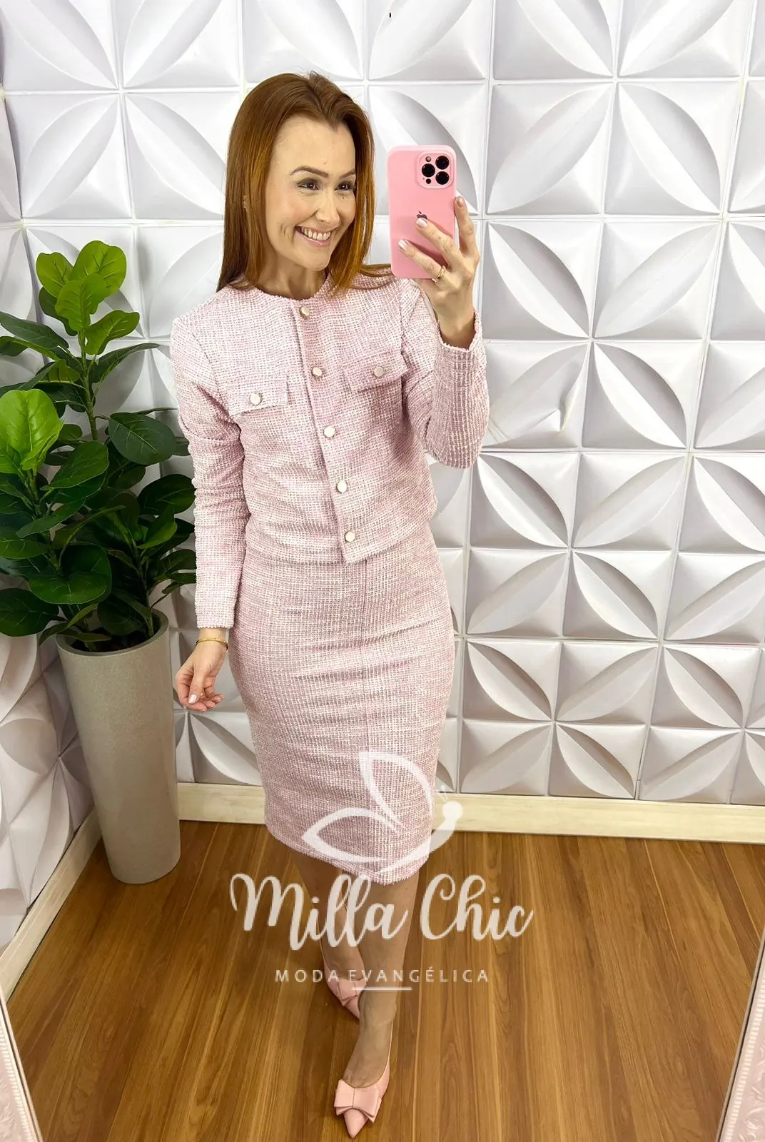 Conjunto Tweed Com Lurex Casaco e Saia Tubinho Cecilia - Rosa - Milla Chic
