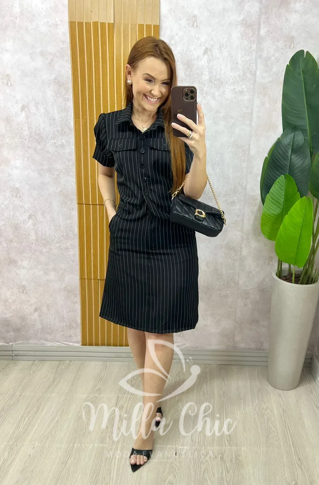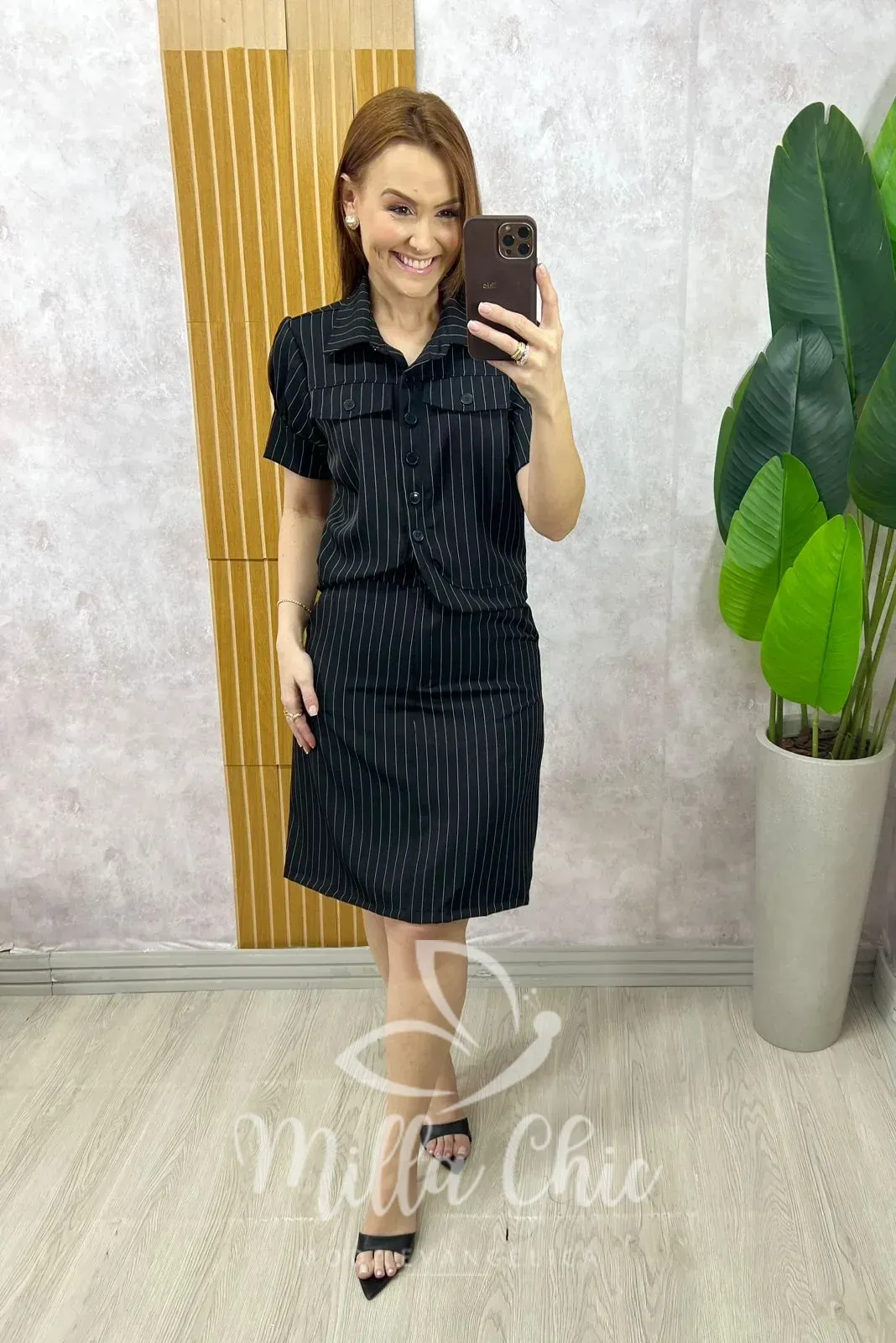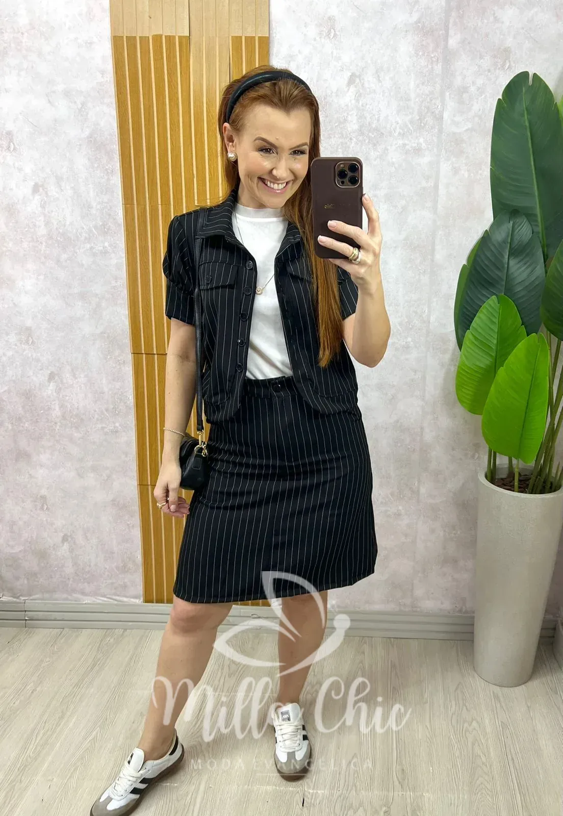 Conjunto em alfaiataria risca de giz, clássico e atemporal, perfeito para compor looks elegantes e modernos.