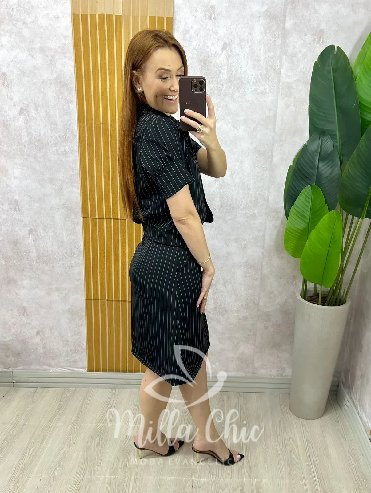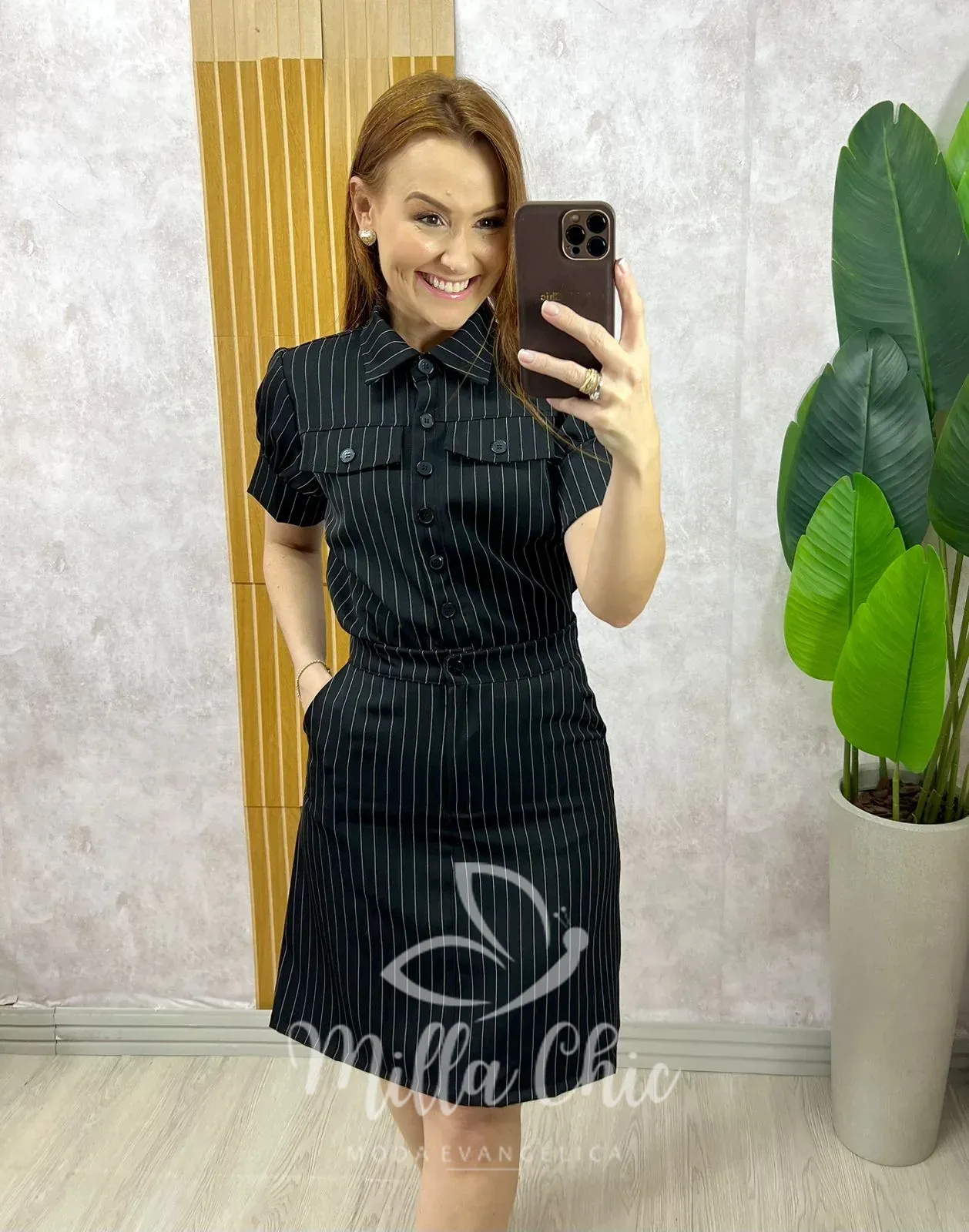 A saia possui modelagem impecável, com bolso faca funcional, cintura bem marcada e caimento levemente evasê, valorizando a silhueta com muito conforto e sofisticação.