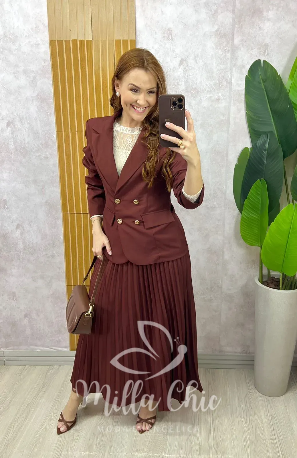 Elegância clássica com um toque moderno. Conjunto Versalhes esse look em três cores lindas , sofisticado traz um blazer estruturado midi com botões dourados, que valoriza a silhueta com imponência e delicadeza. A saia midi plissada complementa a produção com movimento leve e feminino, criando um visual harmonioso e atemporal.