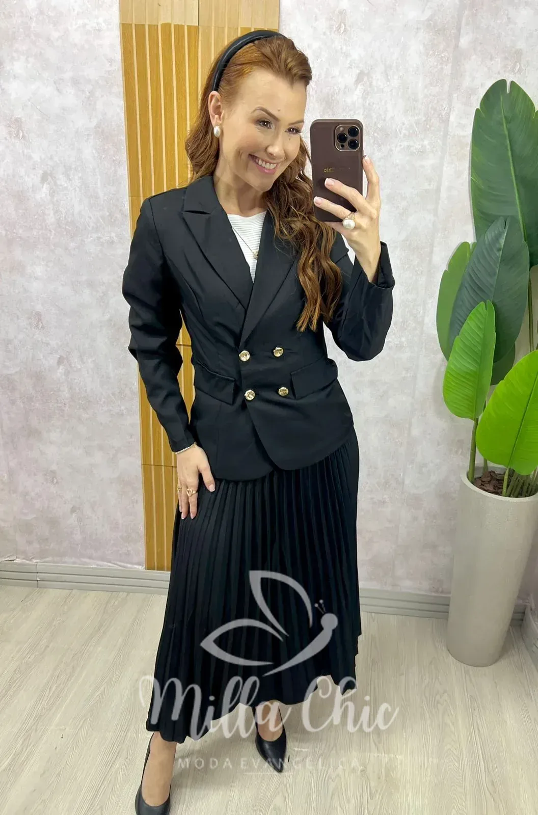 Elegância clássica com um toque moderno. Conjunto Versalhes esse look em três cores lindas , sofisticado traz um blazer estruturado midi com botões dourados, que valoriza a silhueta com imponência e delicadeza. A saia midi plissada complementa a produção com movimento leve e feminino, criando um visual harmonioso e atemporal.