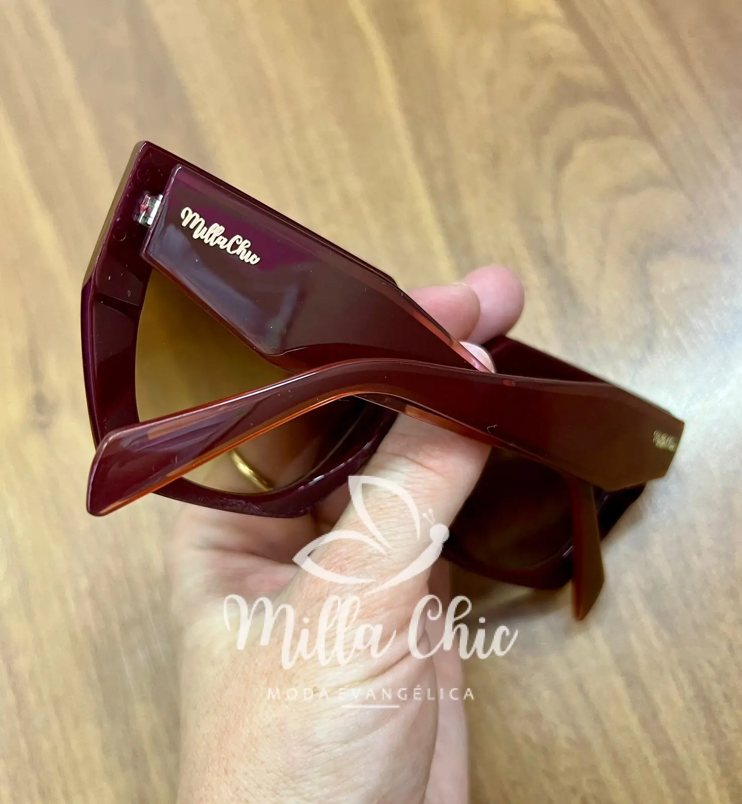 Vem Com modelo Geométrico, Hastes Grossa, lentes marrons, logo na lateral.