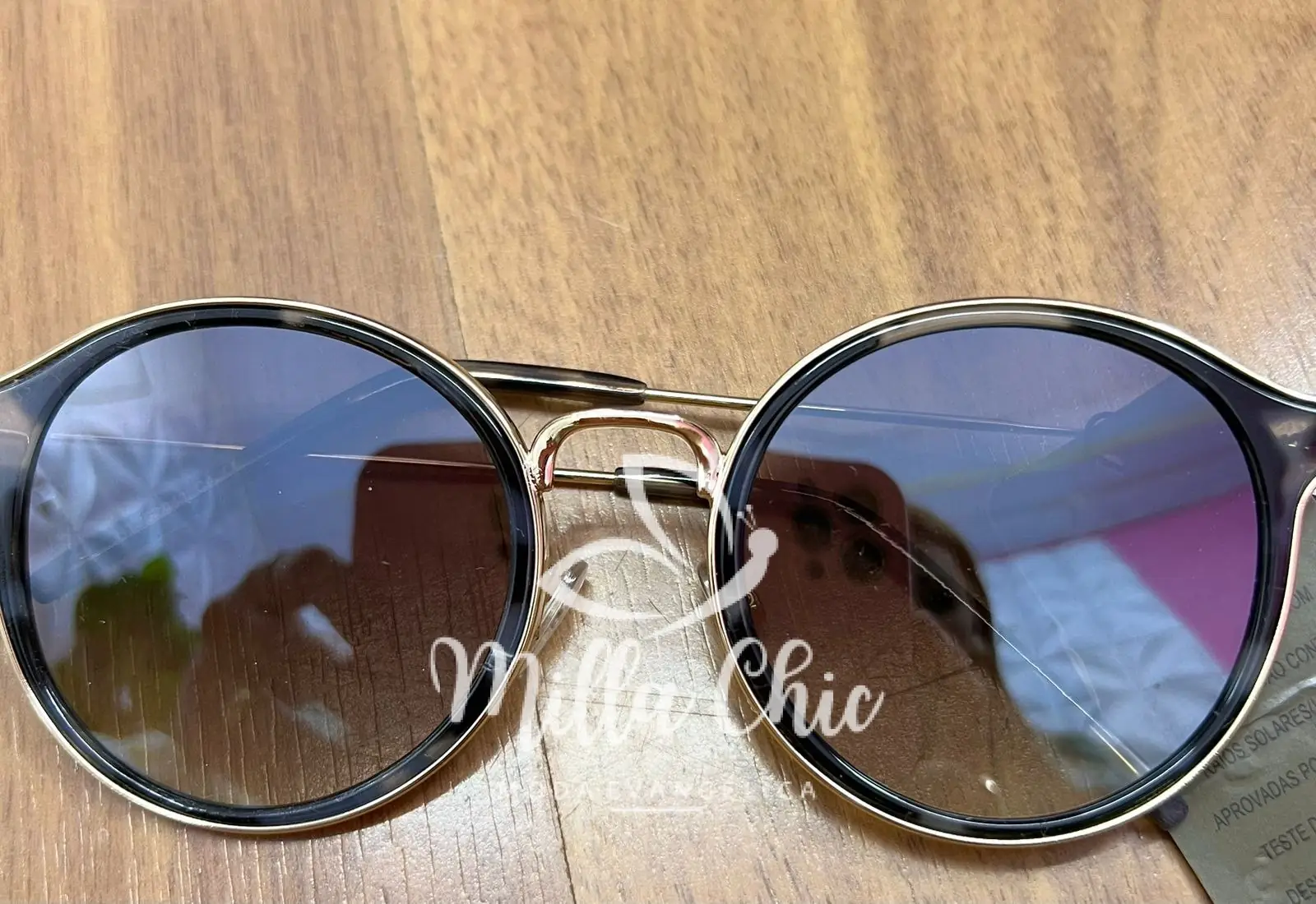 Óculos de Sol que esta incrível!  Vem Com modelo Oval, Hastes Fina no Animal Print com borda toda dourada, lentes preta, logo na lateral.